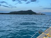 乗船1時間前スコールが降って来てどうなるかなと心配でしたが、止んでくれました。 ワタシ達以外は欧米人でしたが、特に問題はありませんでした。ドリンクはアルコール・ソフトドリンク飲み放題です。 ノリノリの音楽と共にワイキキを出航です。 ワイキキ沖から観るダイヤモンドヘッドはいつも観る形と違っていました。 とても素敵な時間が過ごせました。