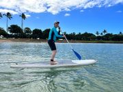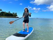 ジミーさんが丁寧に、楽しくコーチしてくれました。長い時間、長い距離を漕がせてくれる充実したアクティビティです。初めはボードに膝をついて漕ぎ、慣れてくると立って漕ぐのですが、油断するとバランスを崩します。私も方向転換の時などに3回海に転落しましたが、楽しい経験です。私たち高齢者の夫婦にとっても、最高に楽しい想い出となりました。