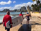 陸で立ち方を教えてもらい繰り返し立つ練習、その後に海へ出発しました!波に乗るまではインストラクターが助けてくれて後は自分でバランス取って立つだけなのでとても容易に挑戦できました!4-5本立つことができて最高に楽しかったです!