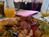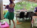 受付ではレイをかけていただき、外の席でビッフェがスタートしました。最初にウクレレをひいてくださる方がバースデーソングやカイマラヒラのフラソングをひいてくださり知っている曲だったので感激しました。つづいてフラダンスを目の前で踊ってくれてご飯中もとても楽しめました。ビッフェの終盤にはフラダンスの体験レッスンがあり誰でも参加できて、私の時はパーリーシェルという曲で基本の動作を教えてくれてすぐに曲がかかりみんなで踊ったのが最高に楽しかったです。ビッフェも味が美味しくてデザートまで満足しました。