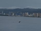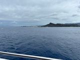 船は4階建てで始めは1階の椅子やテーブルがあるフロアでパイナップルバナナブレッドと飲み物をいただきました。美味しかったです!船が動き出すとクジラの大きさの説明などを実際にロープを使って説明するコーナーがあり、英語であまり内容はよくわからなかったですが大きい船ならではの体験で面白かったです。1階はクーラーが結構効いていて寒かったので上着を持っていくことをおすすめします。説明が終わると船内を自由に移動することができるのですが、寒かったのは1階のみでした。4階のデッキは眺めがよくダイヤモンドヘッドなども見えて綺麗でした。クジラが見えると時計の方向で英語のアナウンスが流れます。英語がわからなくても簡単な英語だったのと皆が一斉に動き出すのでわかります。遠くの方だったので実際に近くで大きいクジラを見ることは出来ませんでしたが遠くても見ることが出来て良かったです。クジラが見れるかどうかは運に左右されますが、見れなくても大きい船なのでクルージングするだけでも楽しめると思います。見れなかった場合もう一度見れるチケット?が配られるというのもこのツアーの良い点だと思います。