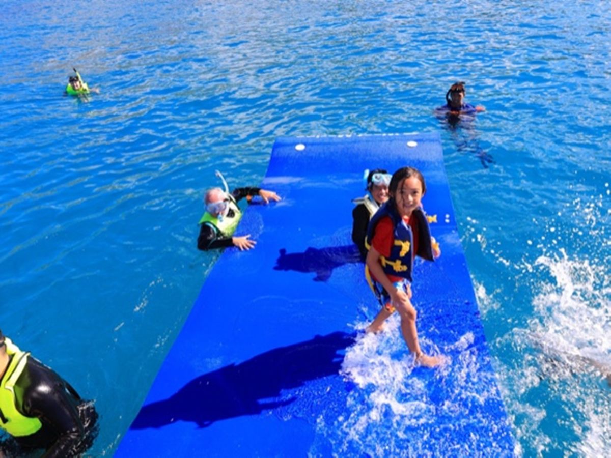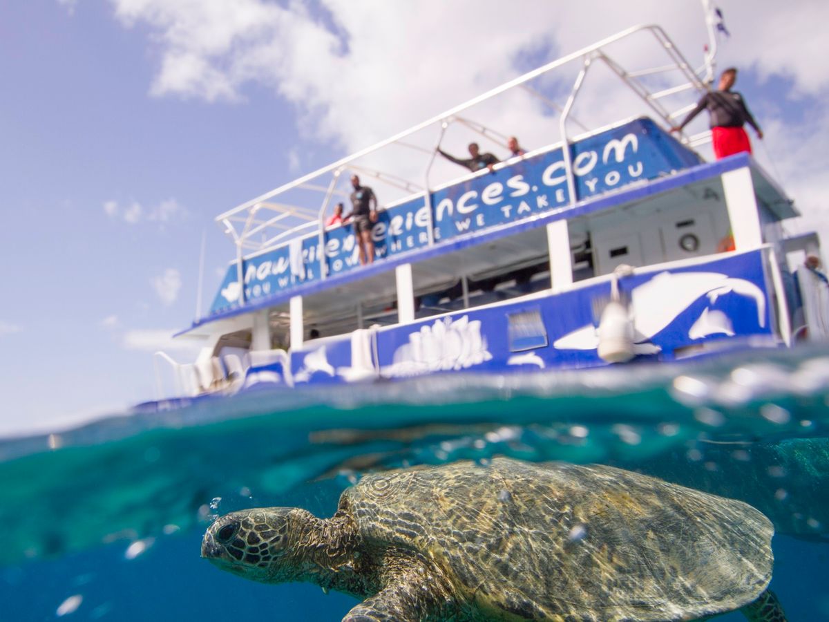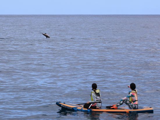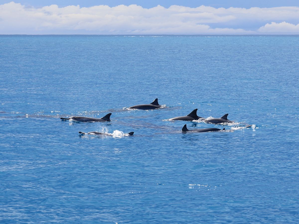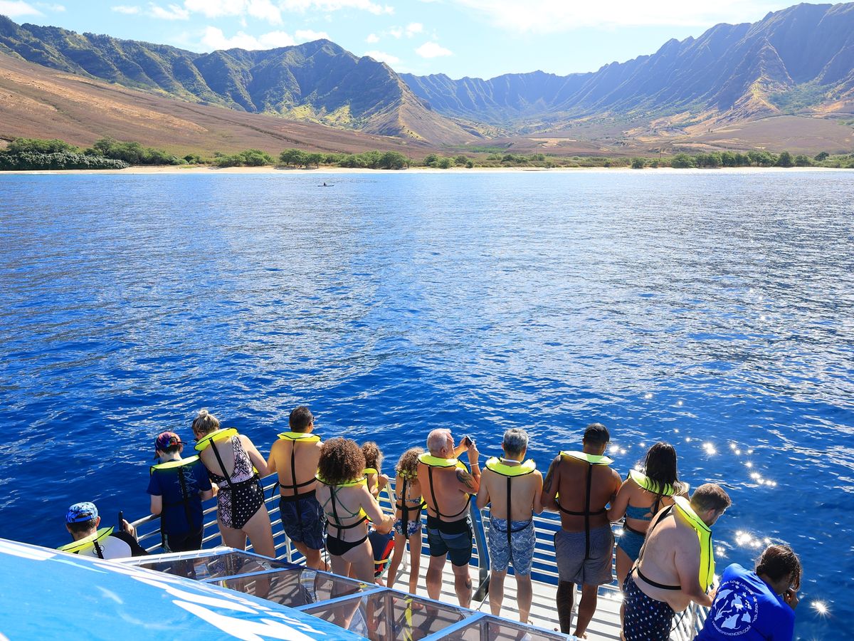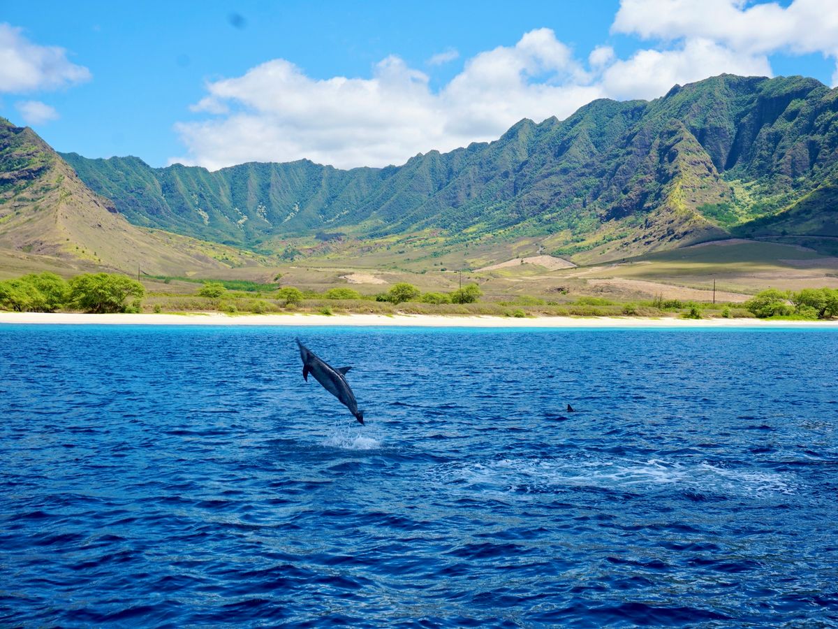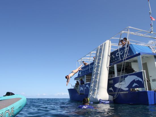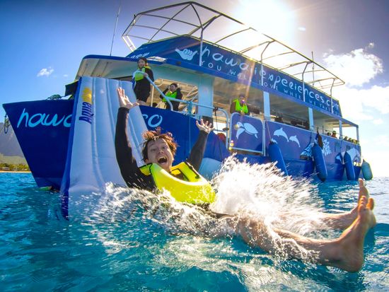 5歳のお子様から楽しめるドルフィンスイム、船上からイルカを眺めるドルフィンウォッチツアーから選択可能!ドルフィンスイムでは野生のイルカと泳ぐ夢のようなひとときを体験できます。広くて新しい快適な高速カタマラン船で、大自然の残る西オアフからイルカを探しに大海原をクルージング。熱帯魚やウミガメを間近で見られるシュノーケリングも。さらには全長6.4mの滑り台やSUPなど、人気のマリンアクティビティも楽しめる盛りだくさんのツアーです。嬉しいランチ付き。