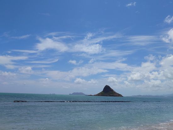 雄大なコウラウ山脈を背に広がるクアロアビーチ。沖には小さな無人島「モリコイ島」があり、島の形が中国人農夫がかぶる帽子に似ていることから「チャイナマンズハット」と呼ばれています。