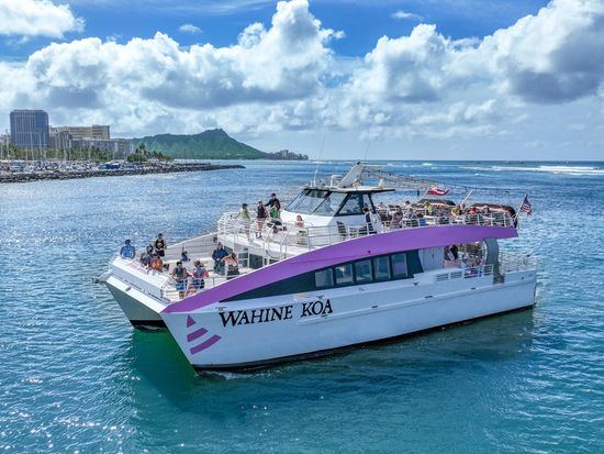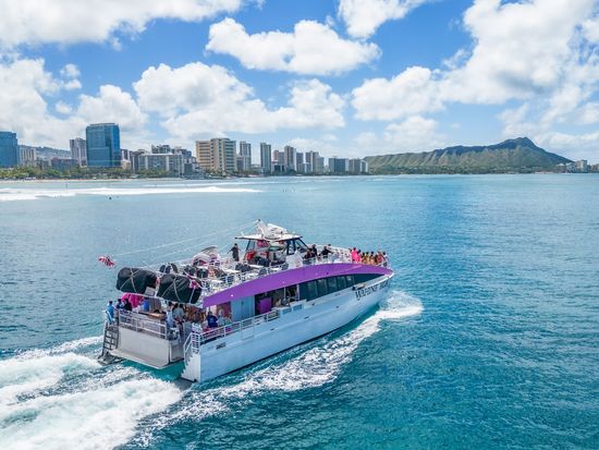 港を出発した後は、ワイキキの海岸線に沿って、ホノルルの街並みやダイヤモンドヘッドを眺めながら、息をのむような美しい景色をお楽しみください。太陽が沈んで空が暗くなると、色とりどりの花火が打ち上げられます。