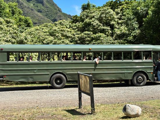 ツアー用のスクールバスに乗り込み、数々の映画やドラマの撮影が行われたクアロアの名所へご案内!