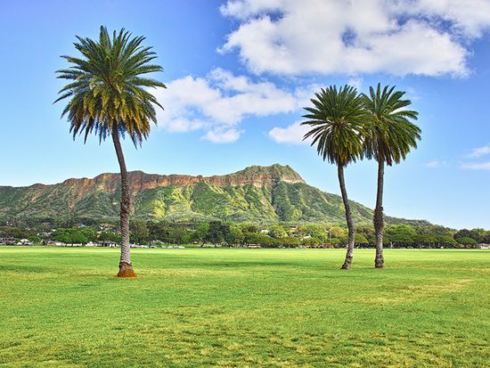 ダイヤモンドヘッドを背に、ワイキキビーチが一望できる絶好のロケーションにあるカピオラニ公園。