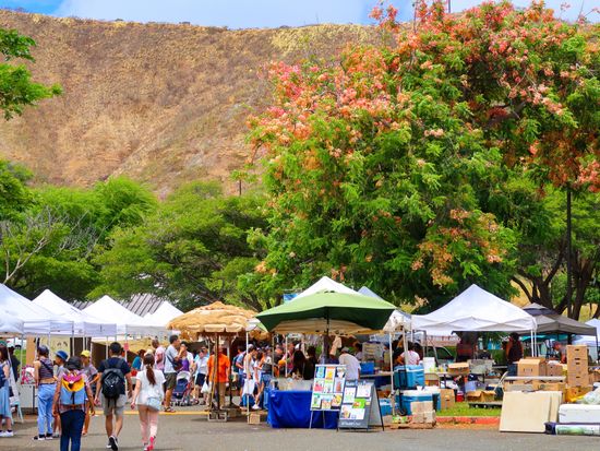 できたてのスナックやスムージーを片手にのんびり散策が楽しめる、ハワイらしさ満点の朝市です。