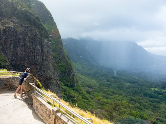 ハワイの大自然を一望できる絶景ポイント、ヌウアヌ・パリ展望台。風が強いことで有名ですが、そのぶん空気も澄んでいて、壮大な山と海のコントラストが見事です。ハワイの自然の雄大さを感じられるおすすめスポットです。