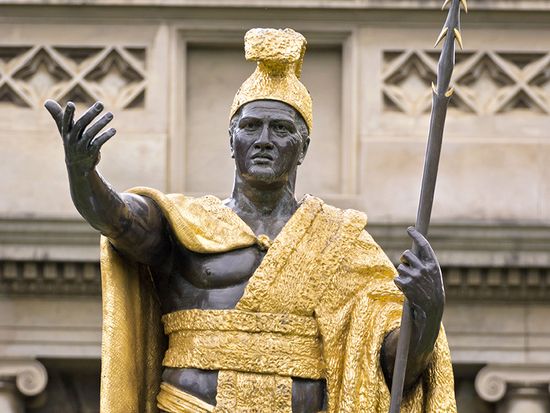 ハワイ王国初代国王・カメハメハ大王の堂々たる立ち姿が印象的な銅像。王国の歴史を感じるシンボルとして、多くの旅行者が記念写真を撮る定番スポットです。