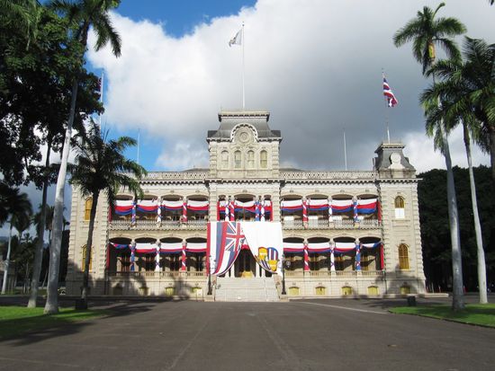 ハワイ王国の歴史を学べるスポット!ホノルルの中心部に位置するハワイ王国の第7代国王カラカウアによって1882年に建てられた宮殿です。セルフガイドのオーディオツアーに参加できる入場料が含まれています。