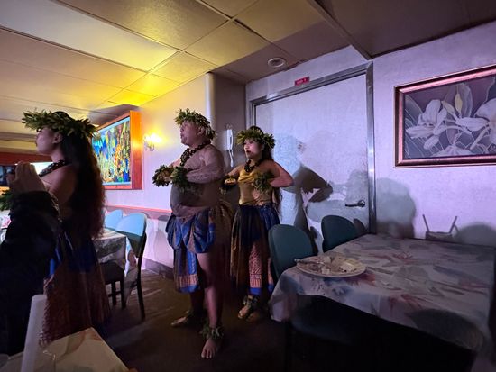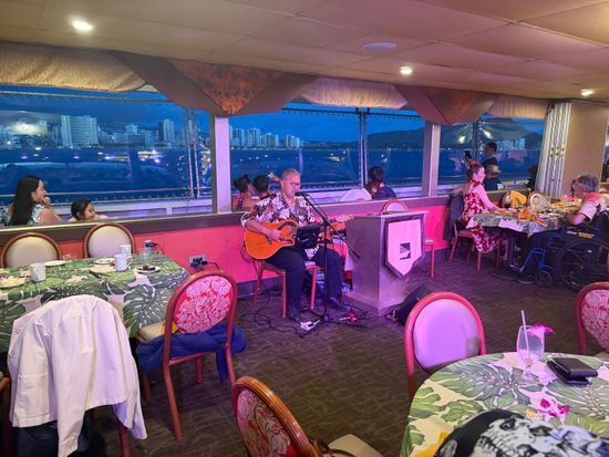 ハワイアンミュージックが流れる船内で優雅な時間