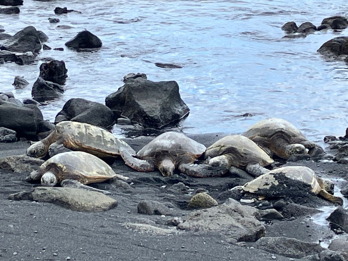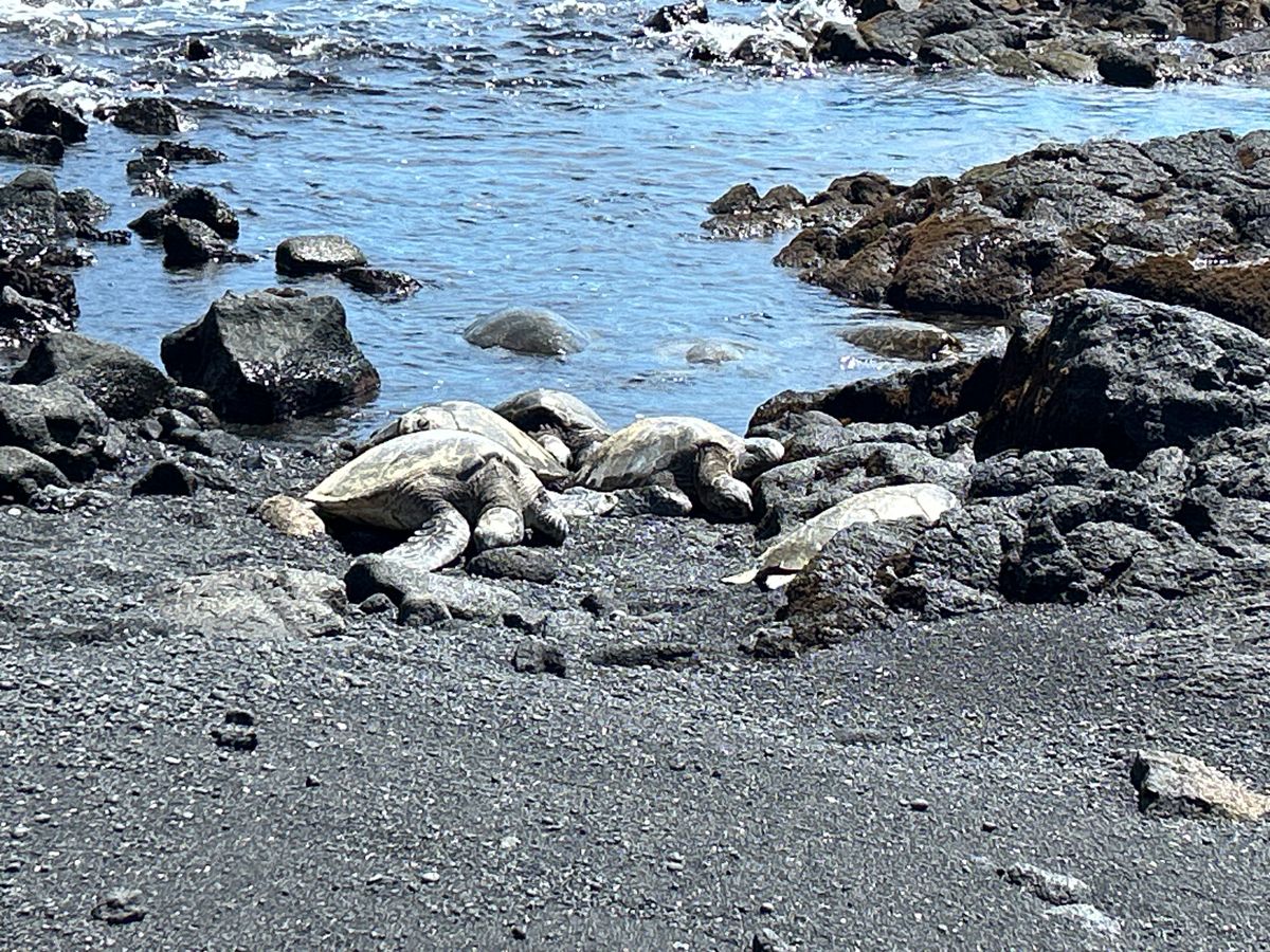 その後、山を下りて、カウコーヒー園でコーヒーの木見学と、売店でコーヒーの試飲と直売。次は、黒砂海岸でウミガメに遭遇、6匹も浜に上がっていました。