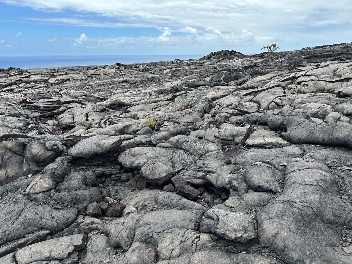 その後はしばしのドライブでキラウエア火口に戻り、スコール降る中を通過して、南の山麓に広がる溶岩原へ。車を下車して溶岩原を各自散策、車を降りてすぐに廃道に溶岩が流れた場所があって、その様子が良く分かった。天気が良くて海も臨め、最高の場所。