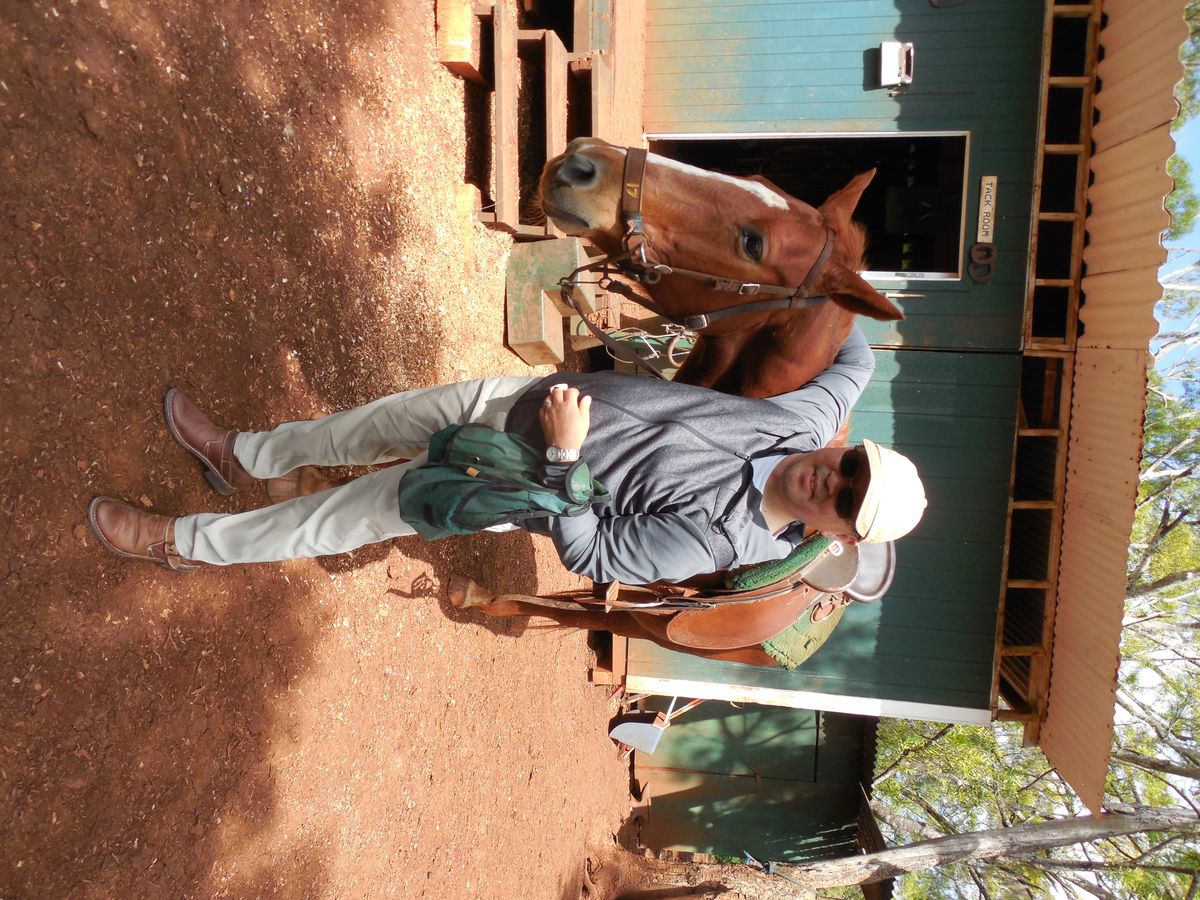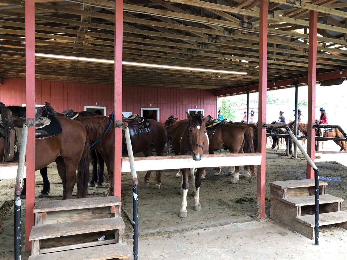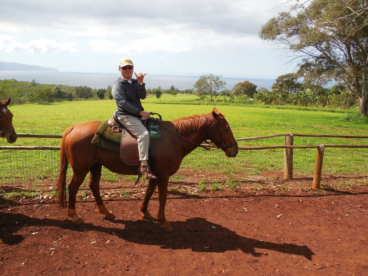 ここから乗馬組とハレイワを観光する方と別れ乗馬に、とっても明るくフレンドリーなご夫妻でご主人は元ポロリーグの選手だったそうです。簡単にレクチャーを受けて直ぐに出発します。