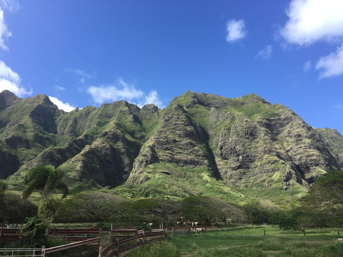 2年前に体験して楽しかったので再び同じプランで申し込みました。乗馬+映画ロケ地巡り+オーシャンヴォヤージュ(カネオヘ湾クルーズ)の3種類です。当日はあいにくの曇り空。行きのバス内でガイドさんがスケジュール調整している時に、波が高いためにクルーズが中止になった・・・との連絡が入り残念ながら別のものに変更。乗馬とロケ地巡りは期待通り楽しめましたが、クルーズの代わりの養殖池と植物園巡りはおとなしい感じのもので物足りなさが残りました(涙)でも安全第一なので仕方ありませんね!2年前より$20近く値上がりしていたようですが相変わらずの人気でした。ギザギザのクアロア山脈を背景にした可愛い牧場では、180頭もの優しいお馬さん達が出迎えてくれてとても癒されました!アトラクションごとに写真も撮影してくれますよ(確か一枚1500円、三枚セットで4000円くらい?)