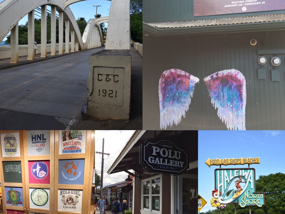 Tシャツを買いにサーフン・シー、目の前にある有名なハレイワの羽で記念写真。