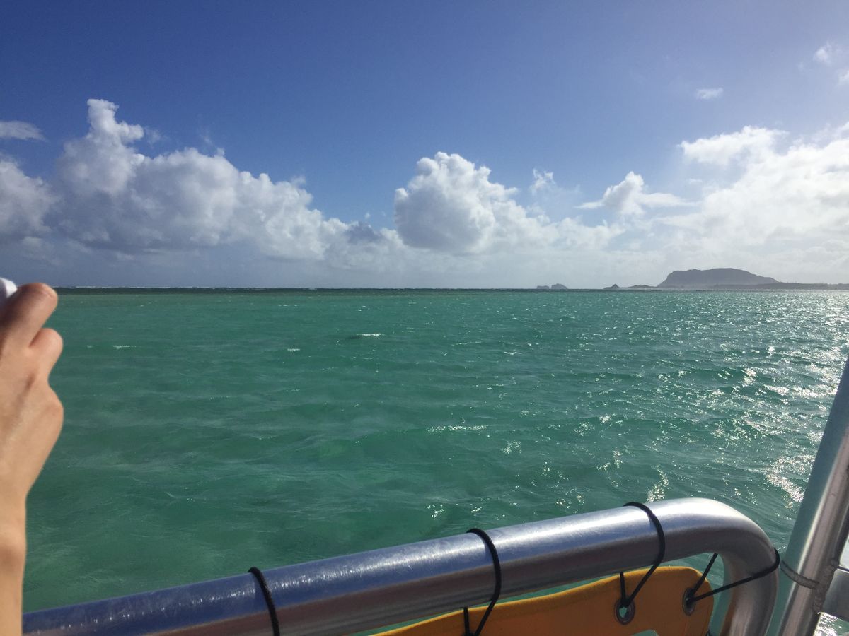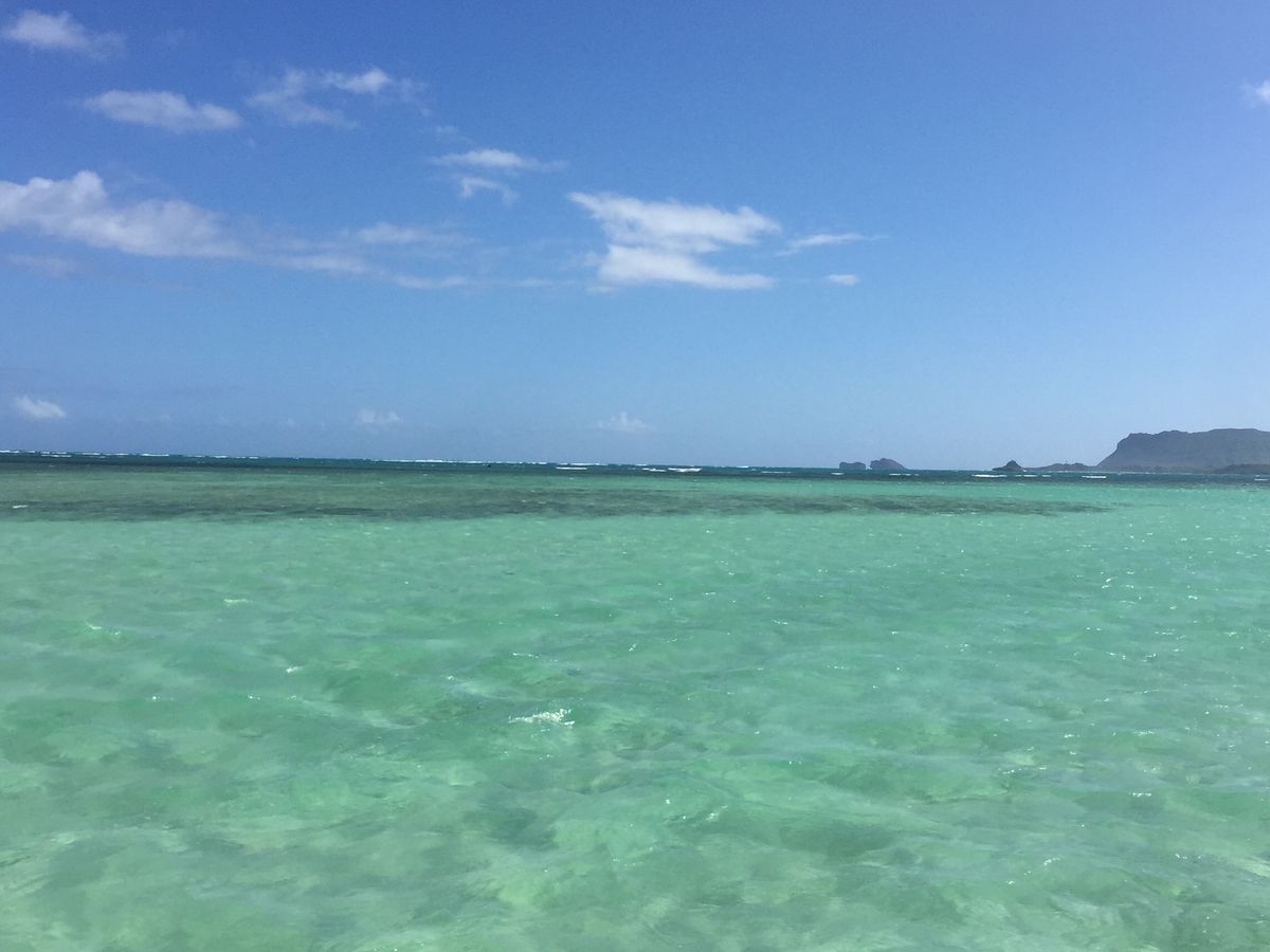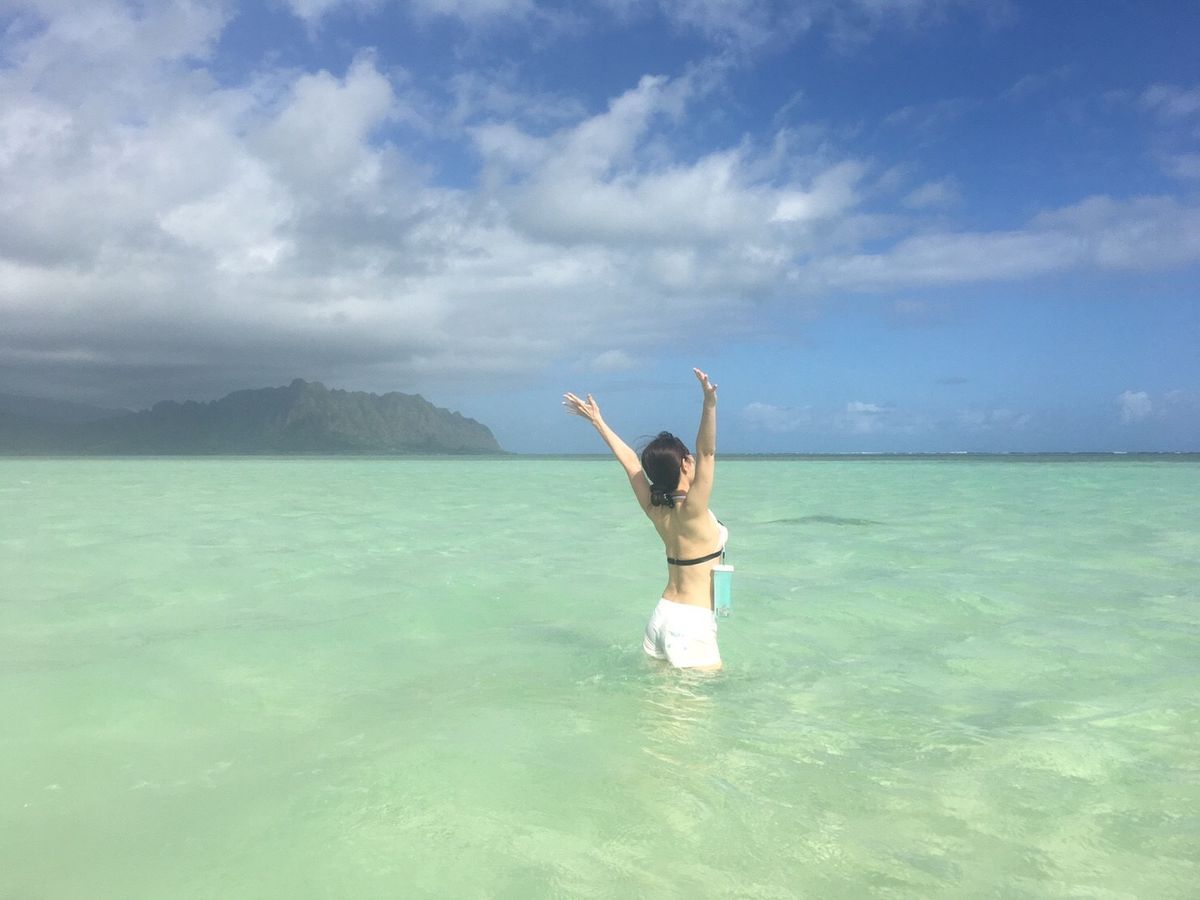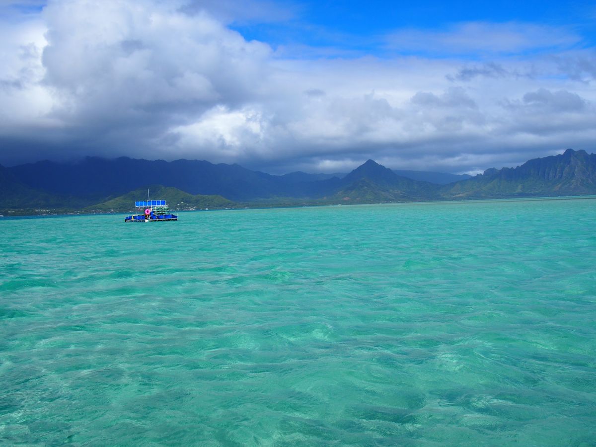 カネオヘ湾の港に着いたときに土砂降りの雨に見舞われ海に出れるか不安でしたが、10分ほどで止み無事に出港。この日は少し水位が高めで一番浅くて太ももあたりでした。雨が降ったからか水が冷たく少し濁り気味でしたが、サンドバーらしいエメラルドグリーンの海を楽しむことが出来ました。
