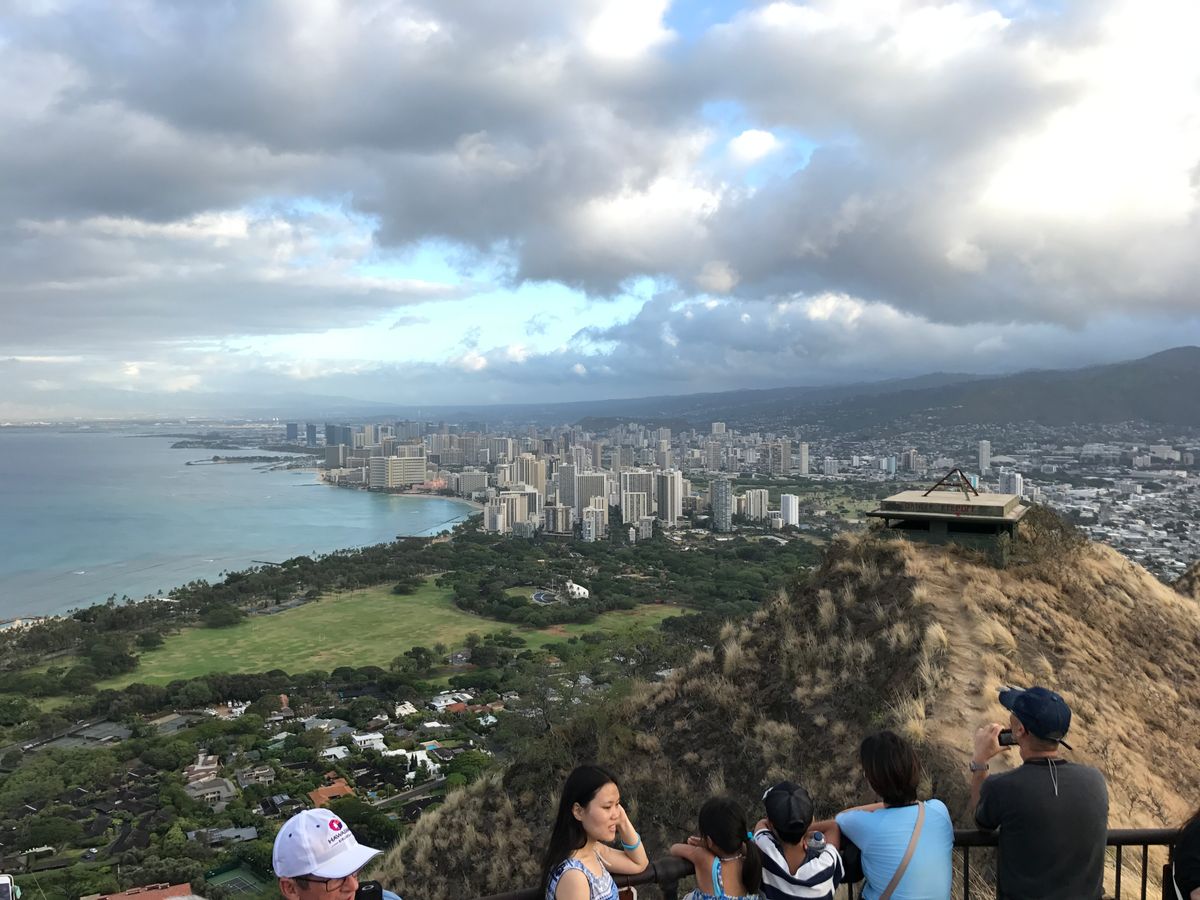 ダイヤモンドヘッドはワイキキからの眺めもいいですが、登って頂上からの眺めも絶景でした。ゆっくり登っても30〜40分とお手軽なハイキングで、頂上付近は観光客で混雑していましたが、オススメです。帰りのバスの運転手さんは日本人の方で、通り道の公園や大学のこと、木々や花の名前など上手に説明してくれ、退屈せずにホテルまで戻れました。