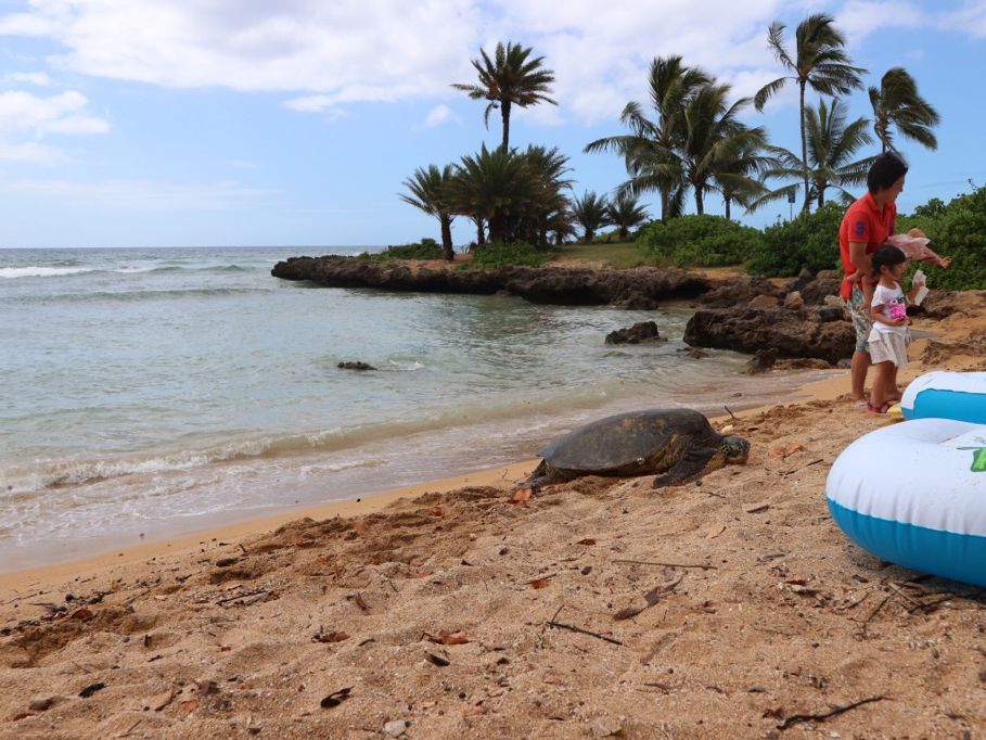 ドールプランテーションでは、お目当てのパイナップルアイスクリームを食べました。甘くて美味しいパイナップルに大満足。また、ビーチで運良く甲羅干しをしているウミガメに出会えて、一緒に記念撮影しました。見られない日もある中、ラッキーでした。
