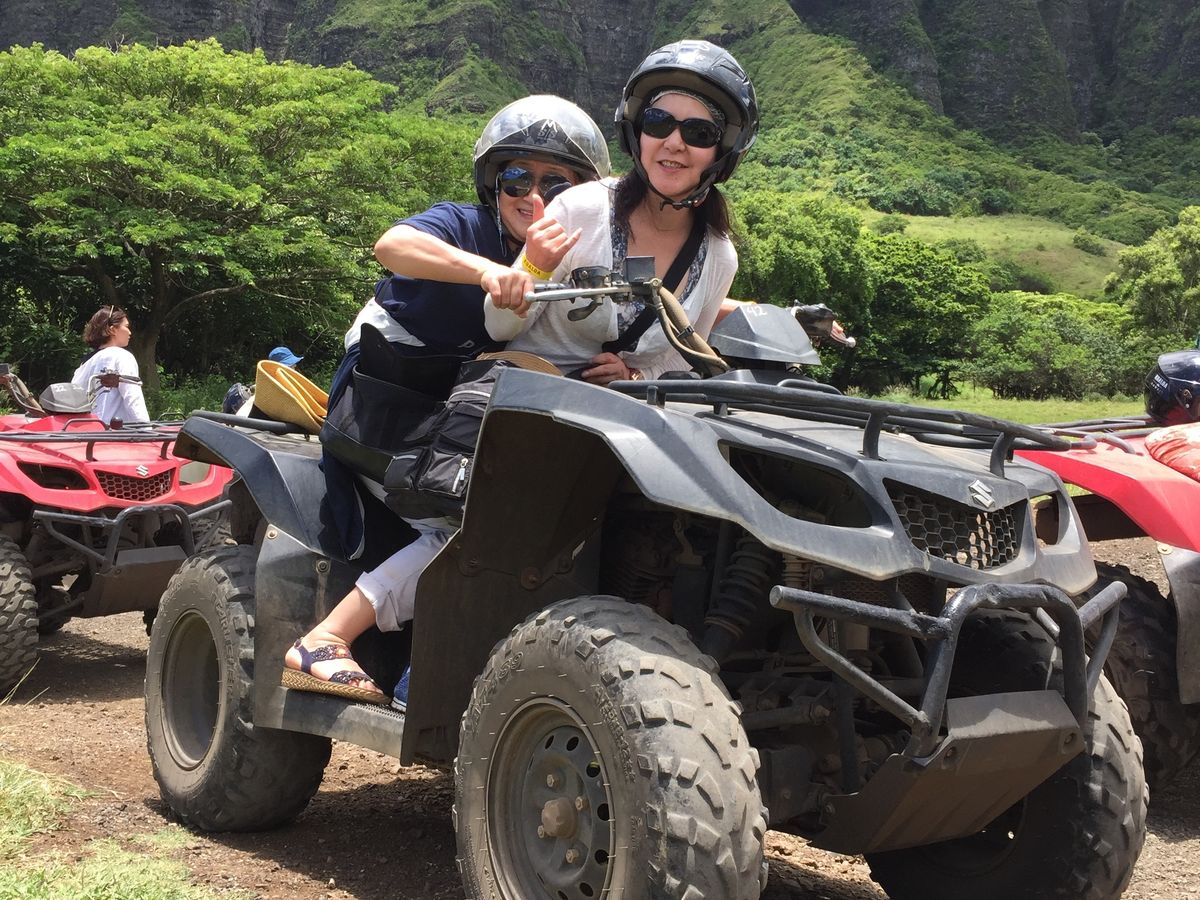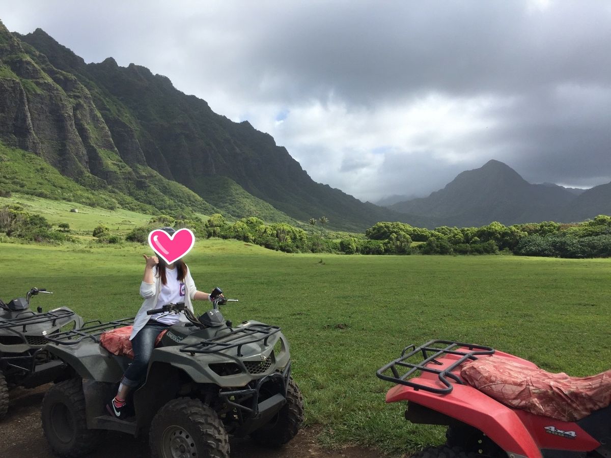 クアロアランチは大好きで今回2度目の参加です。前回は乗馬にちょうせん、今回は四輪バギーち挑戦しました。57歳の私に運転できるか不安でしたが、操作は簡単で、長い距離走るのですっかり慣れて絶好調‼️アップダウンも楽しんで、景色を堪能しました。ただ砂埃がすごく、マスクを持って行くと良かったと思います。その他、カネオヘ湾クルーズはスタッフの方達がとても楽しくて、また是非参加したいです。