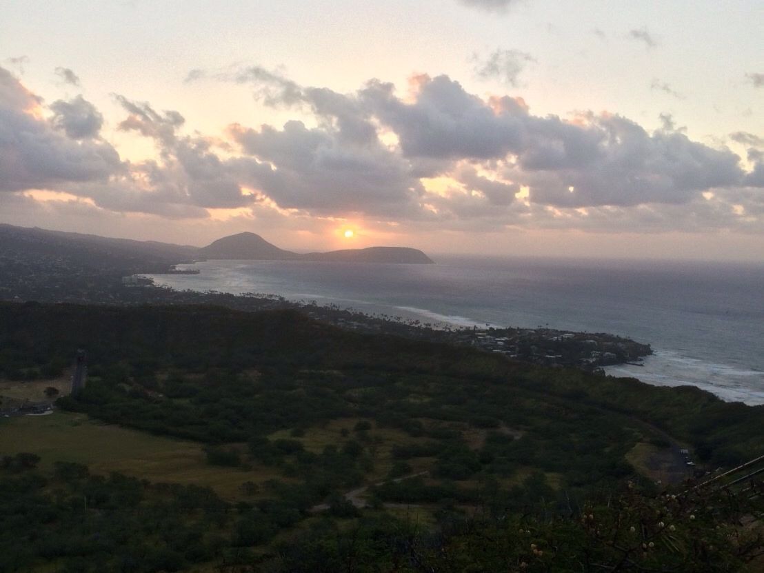 遠くからしか見たことがないダイヤモンドヘッドに登山するということで、今回初めて近くから見ました。近くから見るとかなり高いっ!運動なんてしたことない私が30分内に登るなんて無理!とくじけそうになりながらもスタート。朝日に間に合わせるため、みんな早足で進みます。私も遅れないように必死についていきます。登山道は狭いうえ、大変な人数で自分のペースがつかめず、より疲れが増した気がしました。