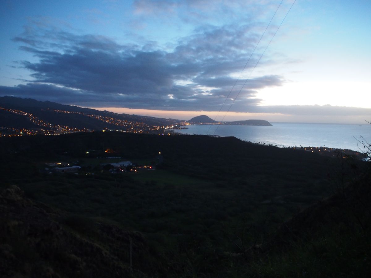 ダイアモンドヘッドに上り始めた時もまだ真っ暗。足元が見えず山道もガタガタなので、懐中電灯を持っていけばよかったと思いました。