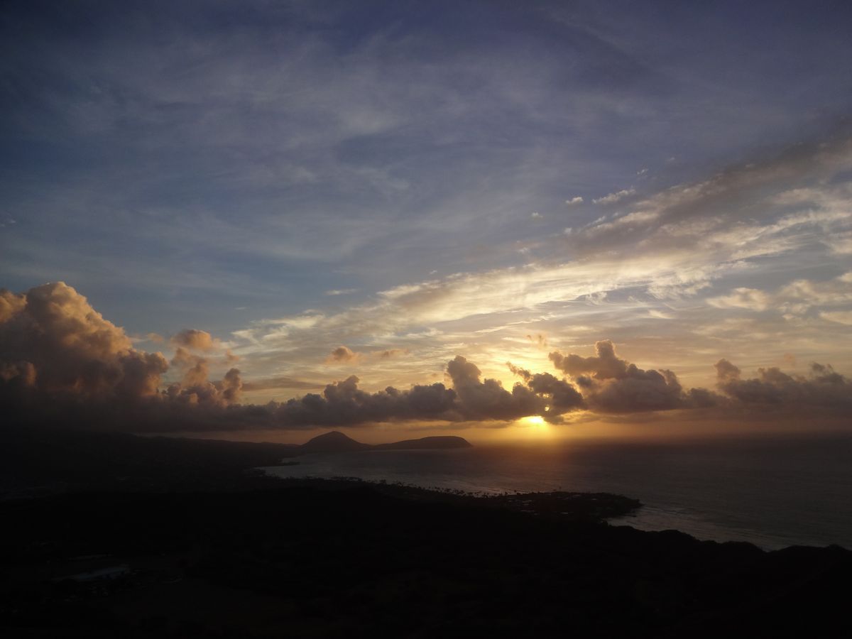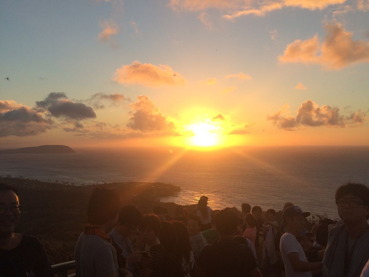 朝6時の開門に合わせ、まだ夜が明けぬ午前5時ピックアップ。人数が少なかったせいか(10数名)、参加者が優秀だったせいか、あっという間にダイアモンドヘッド入口へ到着、一番乗りでした。他の団体客と一緒にツアー担当者から説明を受け、6時開門を待ちましたが、開門時、入口は超混雑。この時期でもこんなに混むんだと痛感。到着順で取り敢えず山頂をめざし歩き始めました。が、長蛇の列ゆえ、その勢いにおされ、景色を楽しむ云々より、早く登らないと!といった感じ。毎朝ジョギングしている現地のオジサンに「右側通行!」と怒られながら、休むことなく展望台をめざし、汗いっぱい!結構キツイ!晴天ではなかったので綺麗な日の出を拝むことはできませんでしたが、順番待ちの展望台で、御日様とワイキキの街、そして海、山を眺め、風に吹かれ、一息つきました。下山後、写真をとり証明書をもらい、朝食のパンケーキハウスへ。アラモアナセンターの向こう側まで行ったところのお店だったみたい。観光客よりも現地の人が来ている感じのお店でした。フルーツ山盛りの超豪華パンケーキではありませんでしたが、シンプルで美味しかった!ツアー価格からしてこれはこれでありかな、といった感じ。ダイアモンドヘッドに登るのが目的でしたので満足しました。
