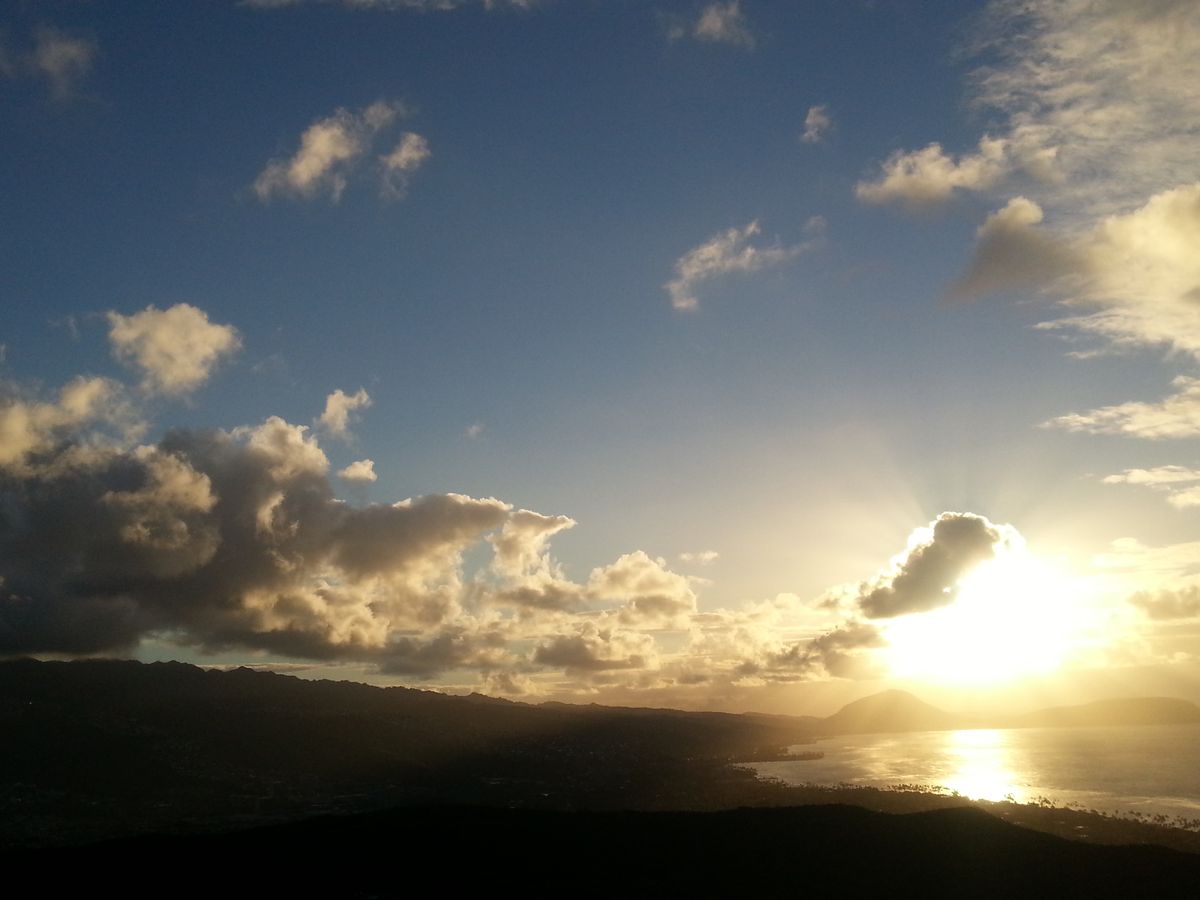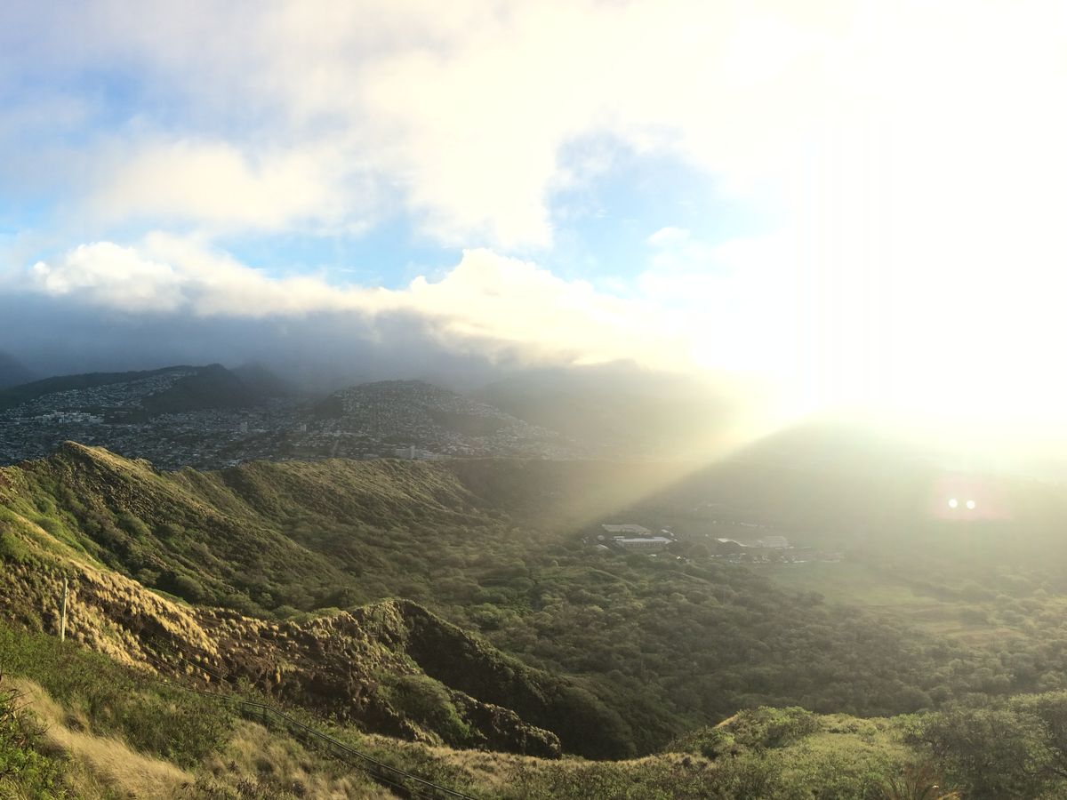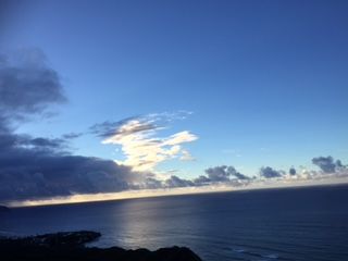 挙式のためにハワイに行き、帰国の日にダイアモンドヘッドに行きました。集合時間はとても早く少し眠かったのですが、バスで迎えに来てくれて約15分でダイアモンドヘッドの入り口に到着しました。駐車場が開くまで外の景色を見て待ちました。そこで朝日がちょうど登ってきて、真っ暗な夜から朝に変わる体験をしました。15分程度の注意事項の説明がありました。そんなことをしている間に、どんどん朝日はのぼってきて、駐車場に入って山を登り始めるころにはすでに朝日が出ていました。どんどん明るくなっていく日差しを背中に受けながらどんどん登って行きました。舗装された道から始まり、次第に少し歩きにくい道に変わっていき、最後は階段を上がっていくという道のりです。前を歩いていたご家族はサンダルで歩いていましたが、所々滑りやすいところがあったり、ハワイの天候は変わりやすいので直前まで雨が降っていることもあるので、スニーカーでの参加をお勧めします。所々写真撮影しながら、40分ほどかけて登りました。山の途中に二人ぐらいが立てる撮影スポットがありました。真下は崖となっているデッキです。高いところが少し苦手な主人は下を見ないようにデッキに立ち、二人で写真を撮りました。そこからまた階段を登って行くと頂上につきます。頂上はたくさんの人がいましたが、代わる代わる写真を撮り合いながら、景色を楽しんでいました。家々のライトが見えるほど暗かった空から、朝日が少しずつ登り、街を照らしていき、次第に山がはっきりとした緑に、海が真っ青になっていく様子はハワイの自然をさらに美しいものにしていました。ハワイで何をやろうか検討されている方はせび朝日を見にダイアモンドヘッドを登ってみてはいかがでしょうか。