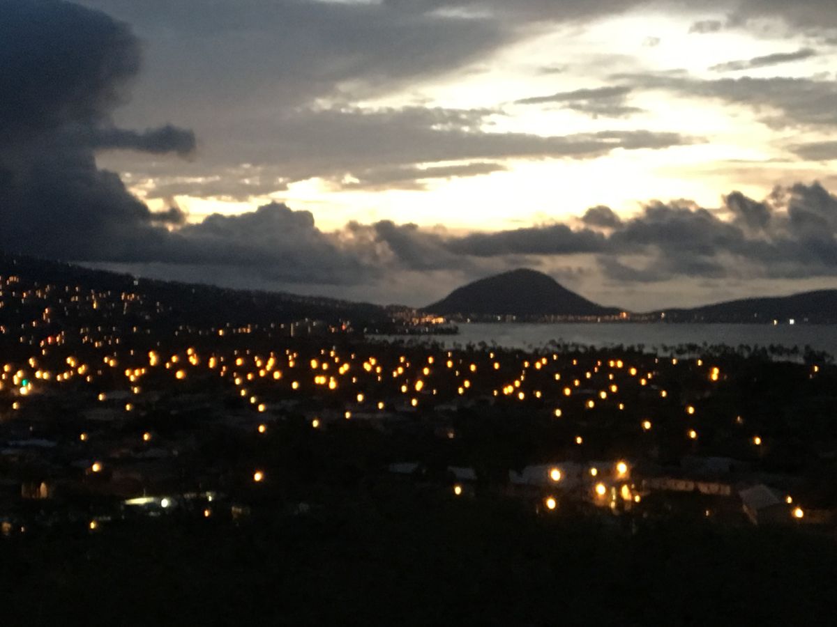 全員が目お開いた第一声が「ワ-オー、最高!」と絶叫に絶叫!眼下に広がる黄金色のワイキキ街にしばし呆然と!ハイライトのホノルル夜景は、神戸・長崎・函館の夜景に負けないほど綺麗で豪華で、ハワイの夜を最大限満喫できました。レナーズのマラサダを食べながら至福のひと時ジョ-イが淹れてくれたホットティ-も最高でした♡。目お瞑らせたのもハワイの夜を最大限満喫させたい優しいジョ-イの心使え!感激の涙で一段とタンタラスの丘、ハワイの夜景が潤み最高でしたアリガトーウ、ジョ-イ!。ジョ-イさんに記念写真を撮ってもらい大満足の一時でした。