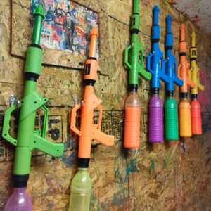 持参したTシャツを重ね着したのでポンチョは使用せず受取ったキャンバスや壁、Tシャツにも落書きを楽しみました。蛍光インクのスプラッターガンはよく振ってから使用する事をお勧めします。キャンバスは箱に入れて持ち帰れるようにしてくれます。