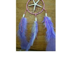 枠の皮の色は白、ピンク、紫、水色などかわいい色から選びます。中の糸も、飾りのビーズも、ぶら下げる羽も、同系色から選ぶことができます。