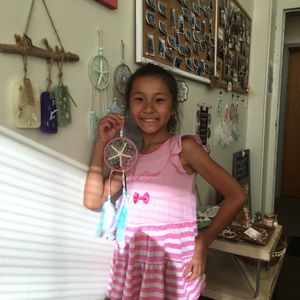 ドリームキャッチャーは、輪っかの紐の色、中の糸の色、羽やビーズの色も全部数種類から選べて、ストーンは誕生月や好きな石を2つ選んで編み込めるので、自分で作ったというオリジナル感があります。オーナーさんのサポートのお陰で、8歳の娘でもそれほど苦戦せず、約1時間ほどで作ることができました。