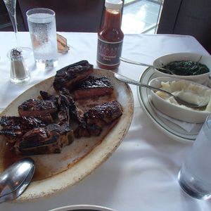 ポーターハウスステーキプラスを頂いてきました。店内は高級店の落ち着いた雰囲気で、サービスも言うことなし。前菜にオマール海老?パン、メインのステーキ、デザート&コーヒーというコース内容でした。ステーキはバーベキューソースよりも塩で食べた方が美味しかったです。