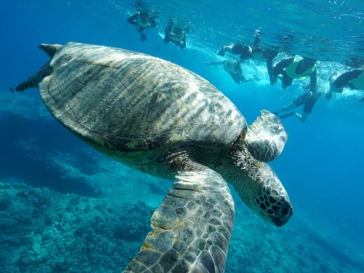 すぐにウミガメがいると教えてくれてその場所へ行くと…いました!!4~5匹見ることができました!20分に1回位水面へ上がってくるので本当に間近で見れます。色んな魚も見ることができました。