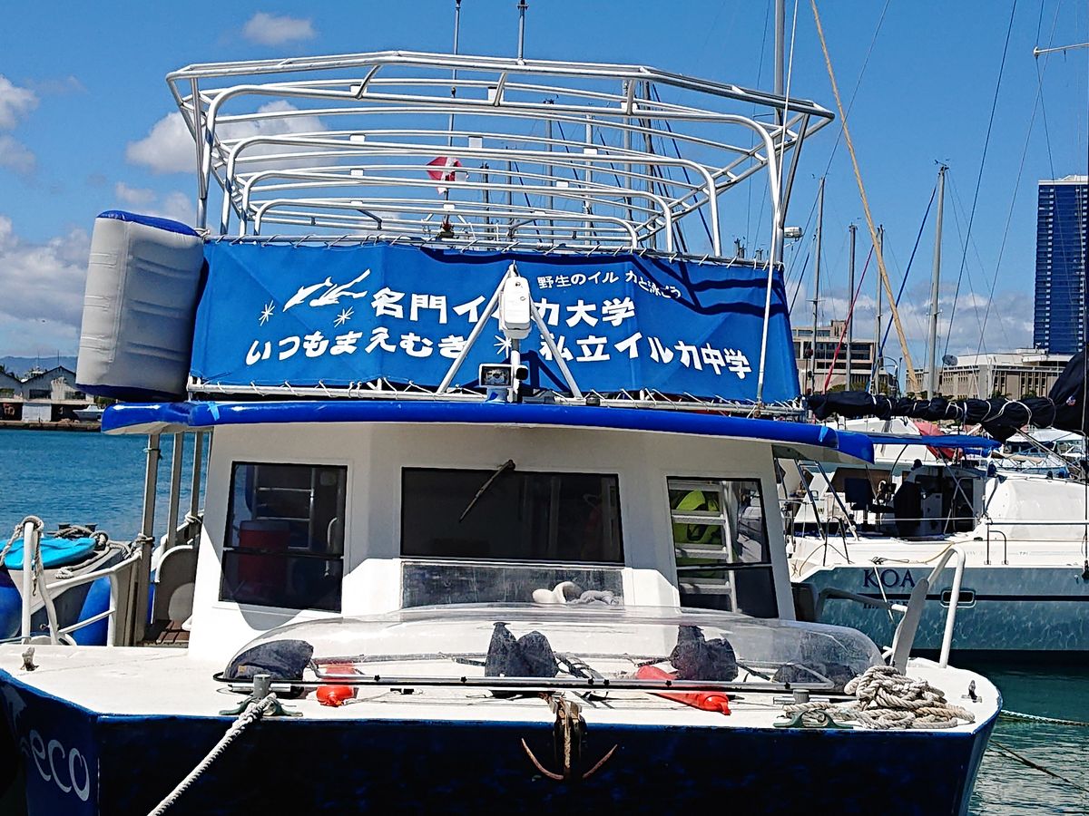 参加当日は強風の為、ワイキキの港から出航できず急きょ「イルカ大学」に合流する形での催行となりました。終了時間も変わるので参加者の午後の予定を確認してからの決定です。