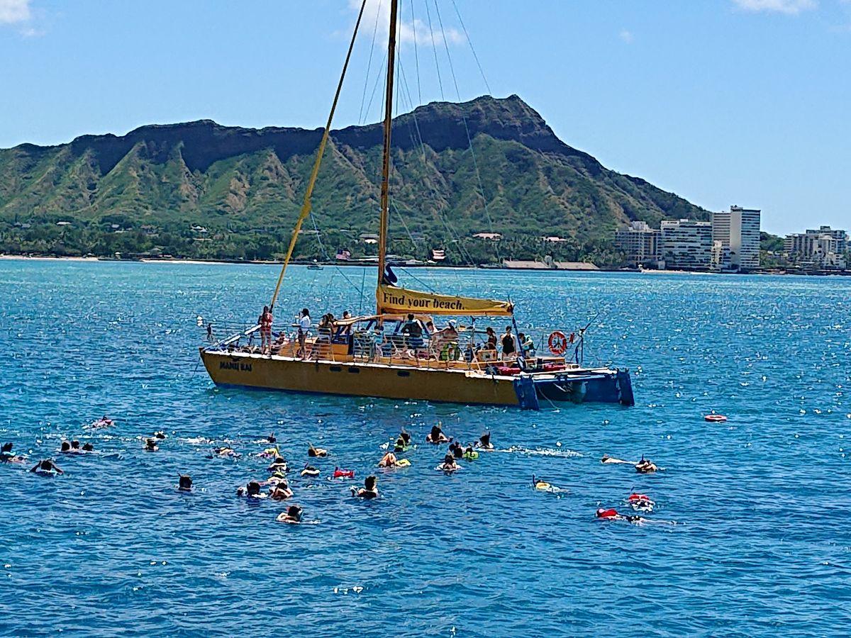 小学生と幼稚園の子供と行きましたが、リピートですが、海にドボンが怖いようで、シュノーケリングは早々に退散。それでもカタマラン号でワイキキ沖の風を切る体験はプライスレスかと。