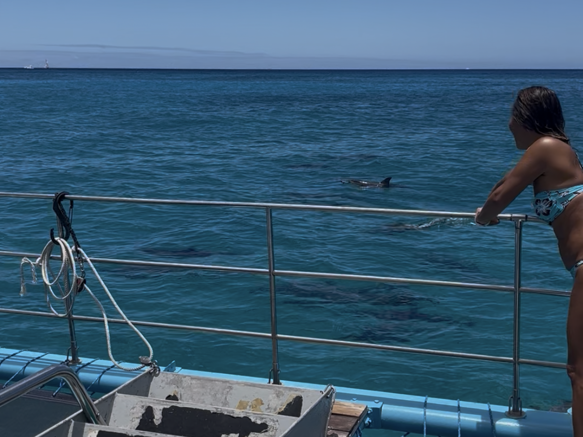 先に船の上から朝日で蛍光色に浮かび上がるシルエットを見た時が1番怖さを感じたのですが、ゲージにガシガシ突進してくる鮫ではなかったので、程よく満足。