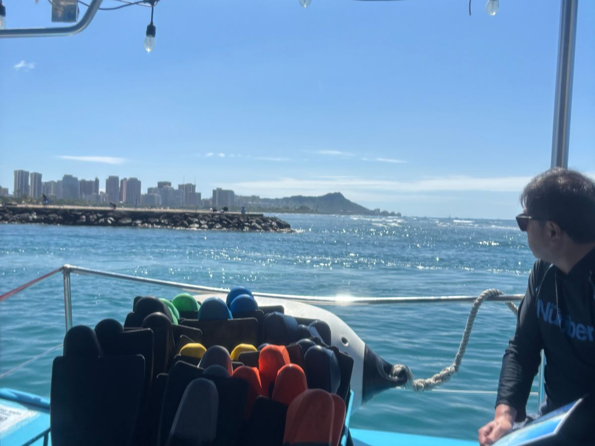 とてもいい天気で、船は揺れるけど酔わなかったです。日本語名物ガイドさんのマキさんのお話がとても面白くて思わず笑ってしまいました。船長やスタッフの皆さんがよくお世話してくださり、魚がいっぱいいて、亀も四ひきくらいいて1時間のシュノーケルタイムがすぐ過ぎてしまいました。ダイヤモンドヘッドをバックに記念撮影して帰りました。