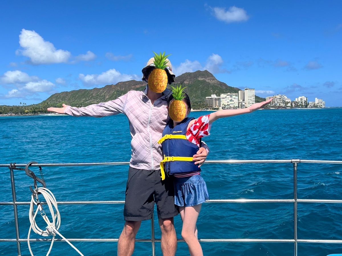 終わった後はダイヤモンドヘッド周辺で写真撮影、帰りは船の先端で、せっかく体乾いて温まっていたのにのにスプラッシュマウンテンを味わいました笑