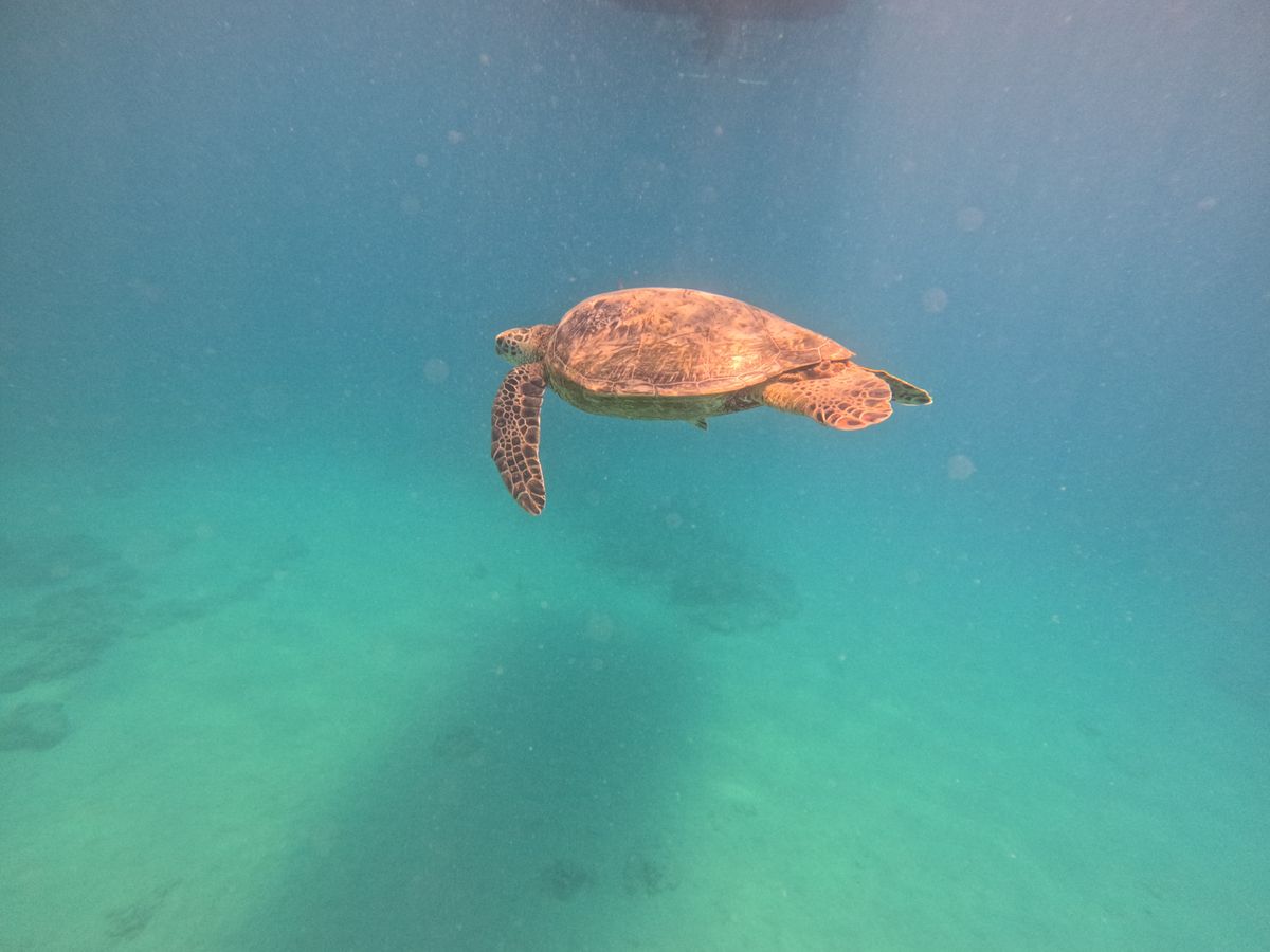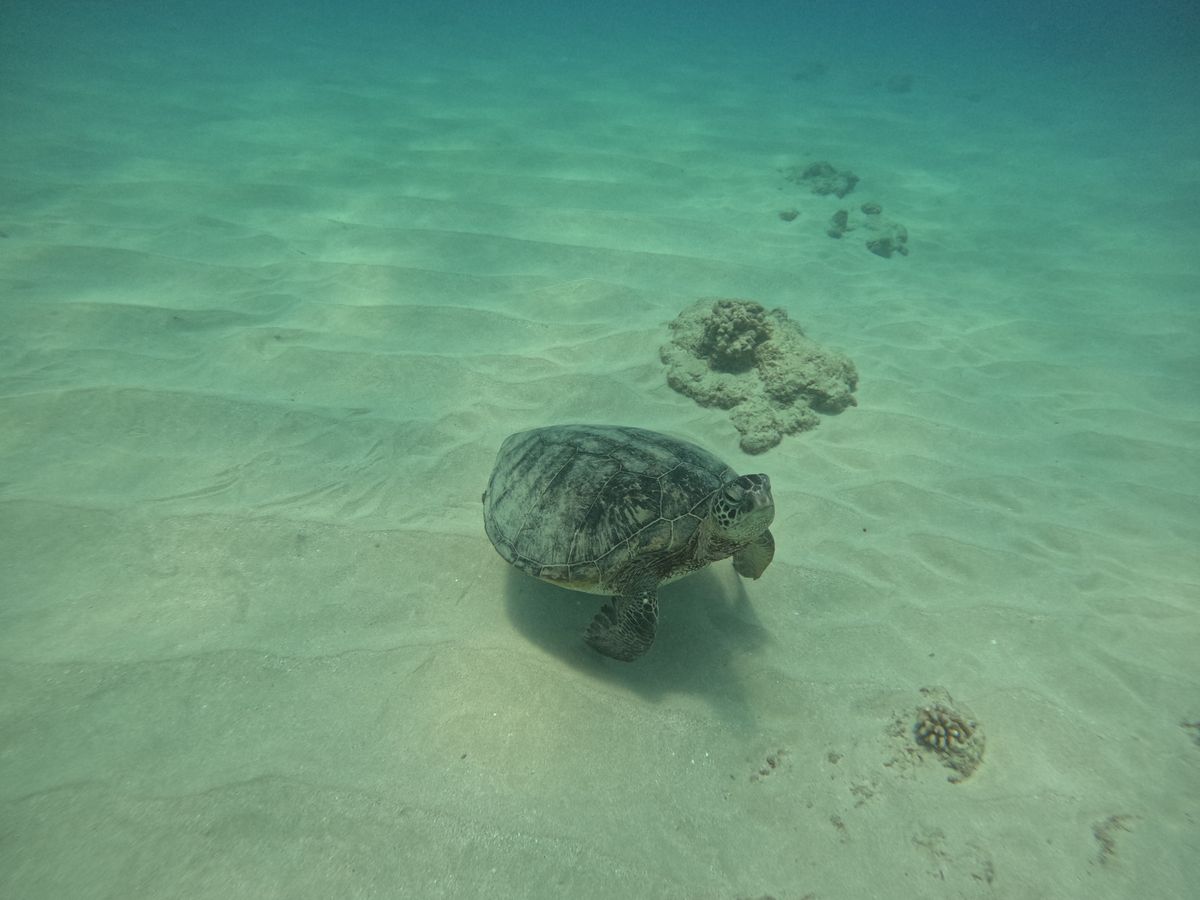 当日、船でワイキキ沖に出ると風景も風も心地よく、船の上からでもウミガメにも出会えました。前日にはイルカもいたそうです。シュノーケリングではウミガメがすぐそばに!他の魚も手に触れるほどたくさん出会えて、なかなかできない体験に感動しました。