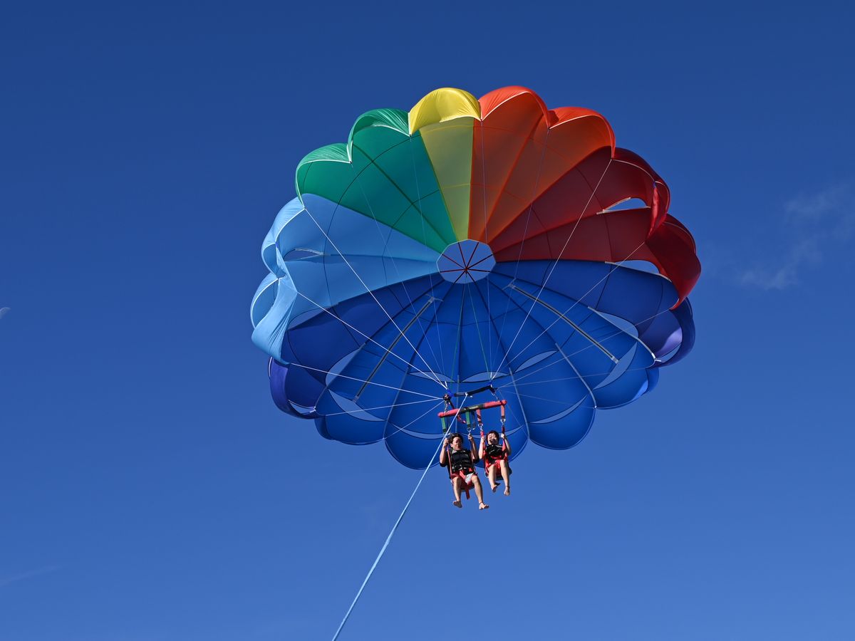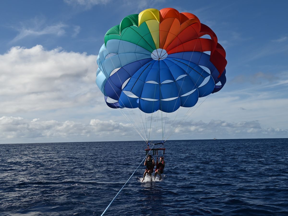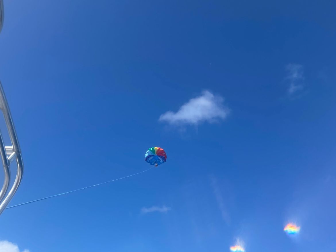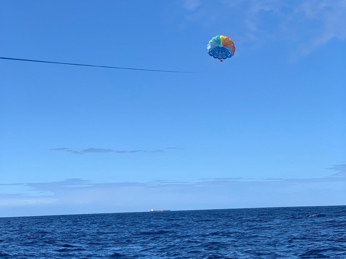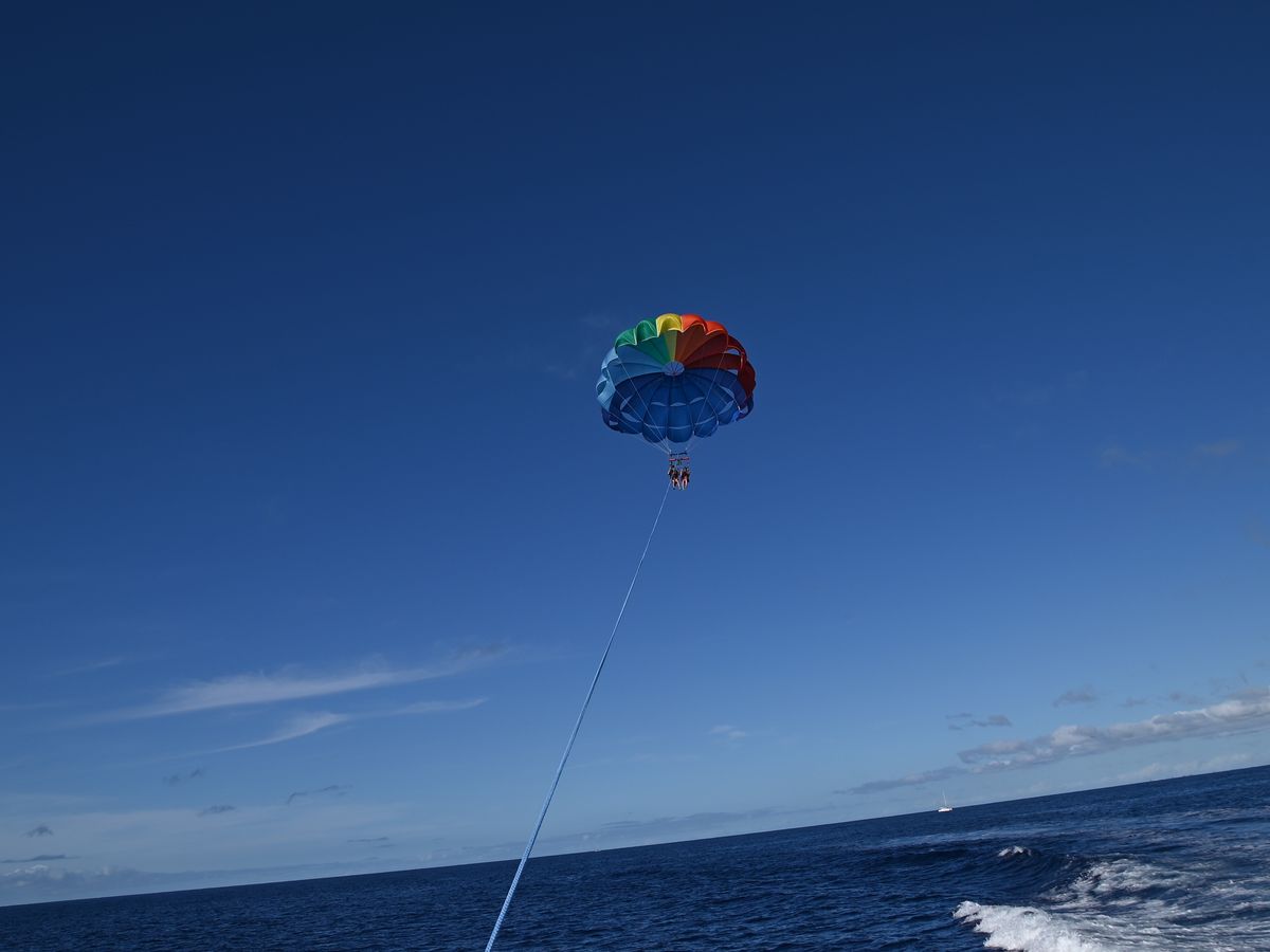 思い立って当日の午後予約、最終(17:00)でパラセイリングにチャレンジしました!予約から現地での案内まで全てスムーズで、一生忘れられない体験となりました。私は船酔いしやすいので酔い止めの薬を服用しましたが、飛んでいる時よりも小型船で移動している時の方が酔いやすいかと思うので、心配な方は酔い止め服用をお勧めします。