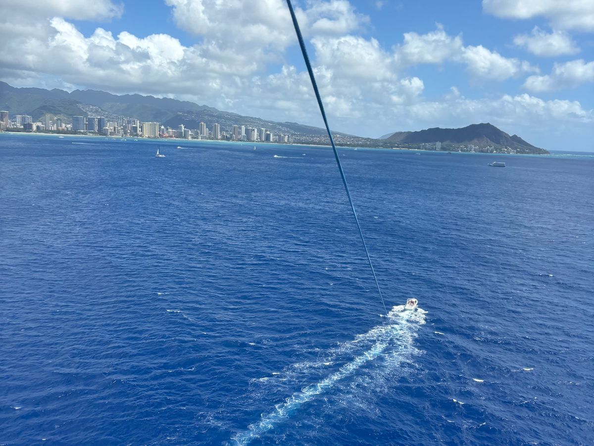 ライフジャケットを着て、小さめの船に乗り出発しました。一組ずつ上げてもらい、5分強ほど上空でした。ダイヤモンドヘッドや町がよく見えてきれいでした。