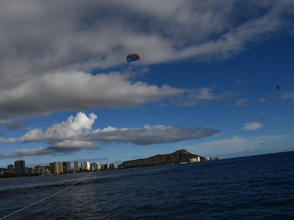 晴天に恵まれ、パラセイリング中はワイキキ、ダイヤモンドヘッドも足元に見え最高な気分になりました。操作員もベテランで、風を読みモーターボートを操り、足だけを海に浸けたりし、楽しませてくれました。70代夫婦