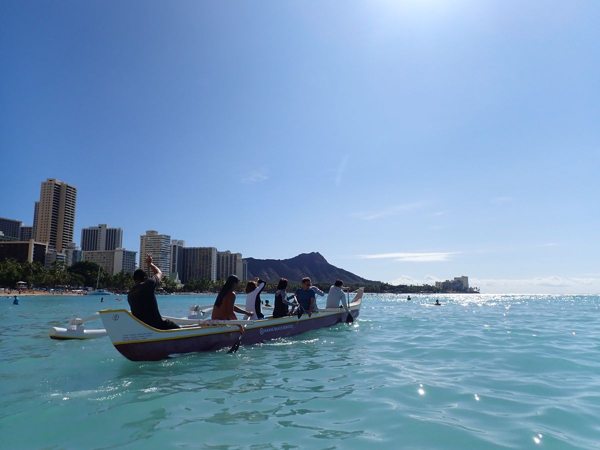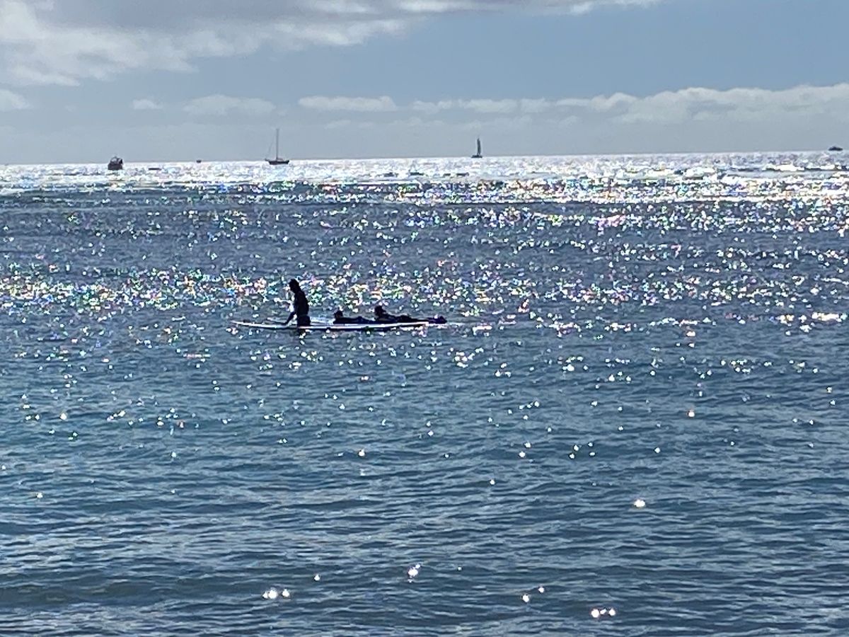 体験自体は、初めてで、非常に楽しかったが、 ワイキキ沖は、北東の風(貿易風)が、昼ぐらいから強く吹いてくるので、朝早い時間を選択するのがベターである。