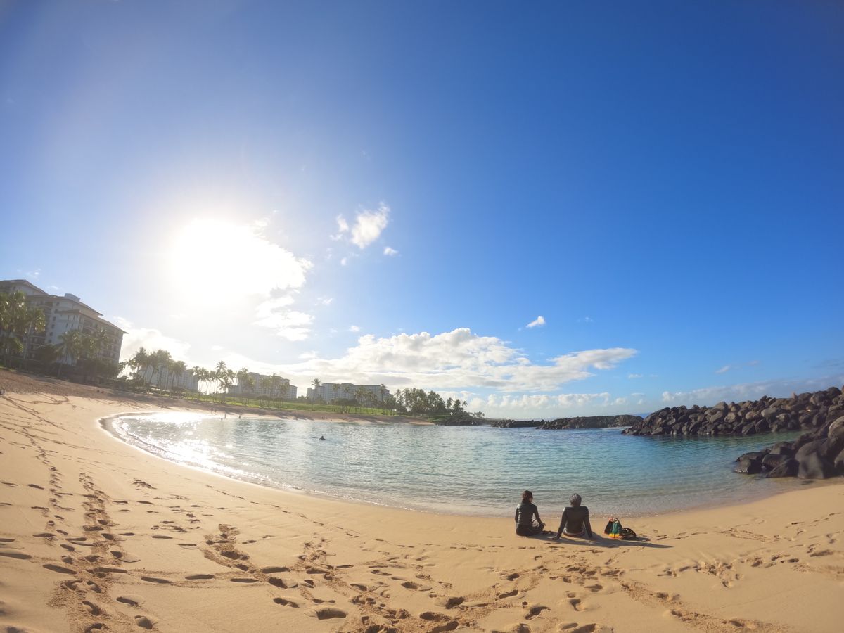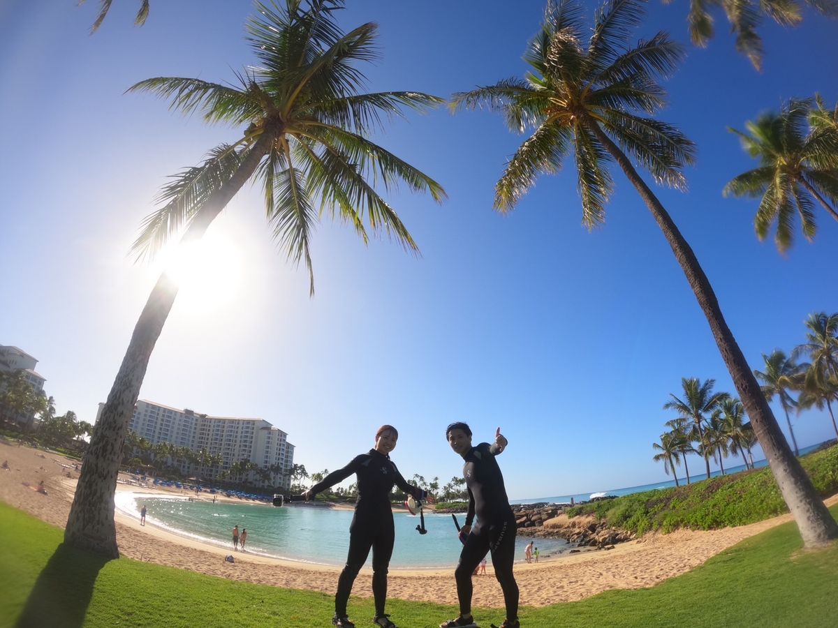 年始に6泊8日でワイキキに宿泊し、他社のツアーでも天使の海付近やワイキキ沖でシュノーケリングをしました。この日は疲労もたまって体力的に不安だったので、コオリナのラグーンの浅瀬へ。結果として、このツアーがいちばん満足度が高かったです。安全な浅瀬でいろいろな魚を見ることができましたし、蛸も見れました。