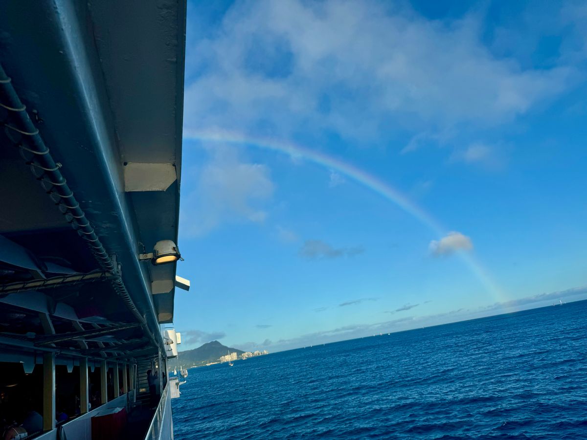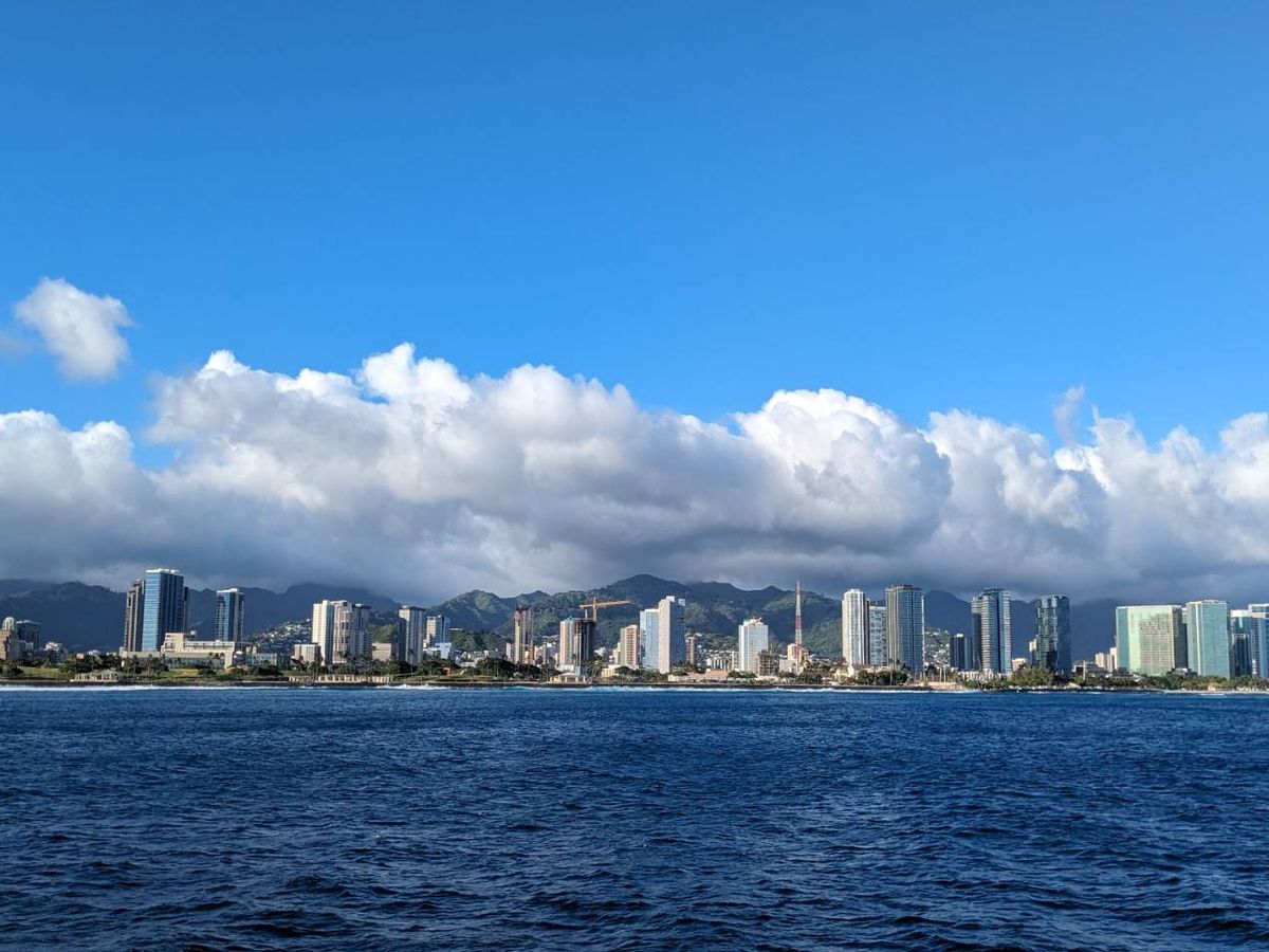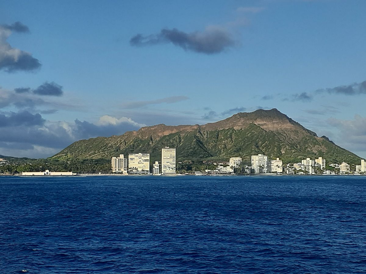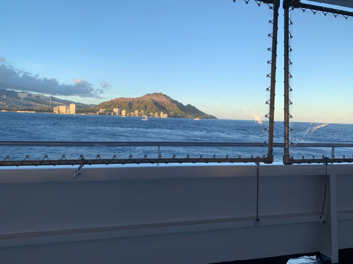 海から眺めるダイヤモンドヘッドとワイキキのホテルの景色が素晴らしい。食事も美味しかった。エンターテイメントのフラが港に着いてからも続いていたのは時間が押してしまったからでしょうか?