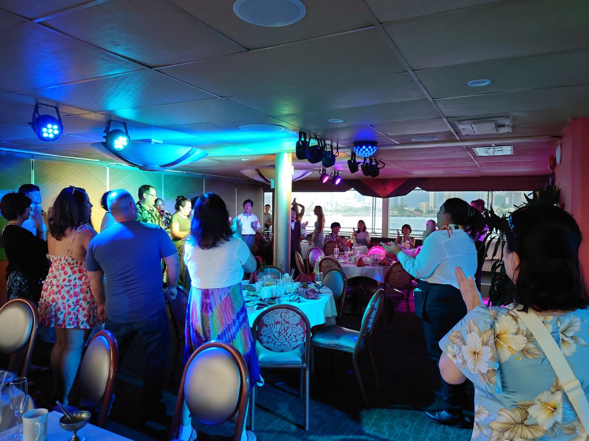 好天にめぐまれ、窓際席で海から見るワイキキ、ダイヤモンドヘッドなどの景色やサンセットまでを眺める一方、船内では素敵なおどりと音楽で盛り上げていただき、ハワイの雰囲気いっぱいでした。ごちそうと美しい夕日が最高で、ワインで乾杯しました。