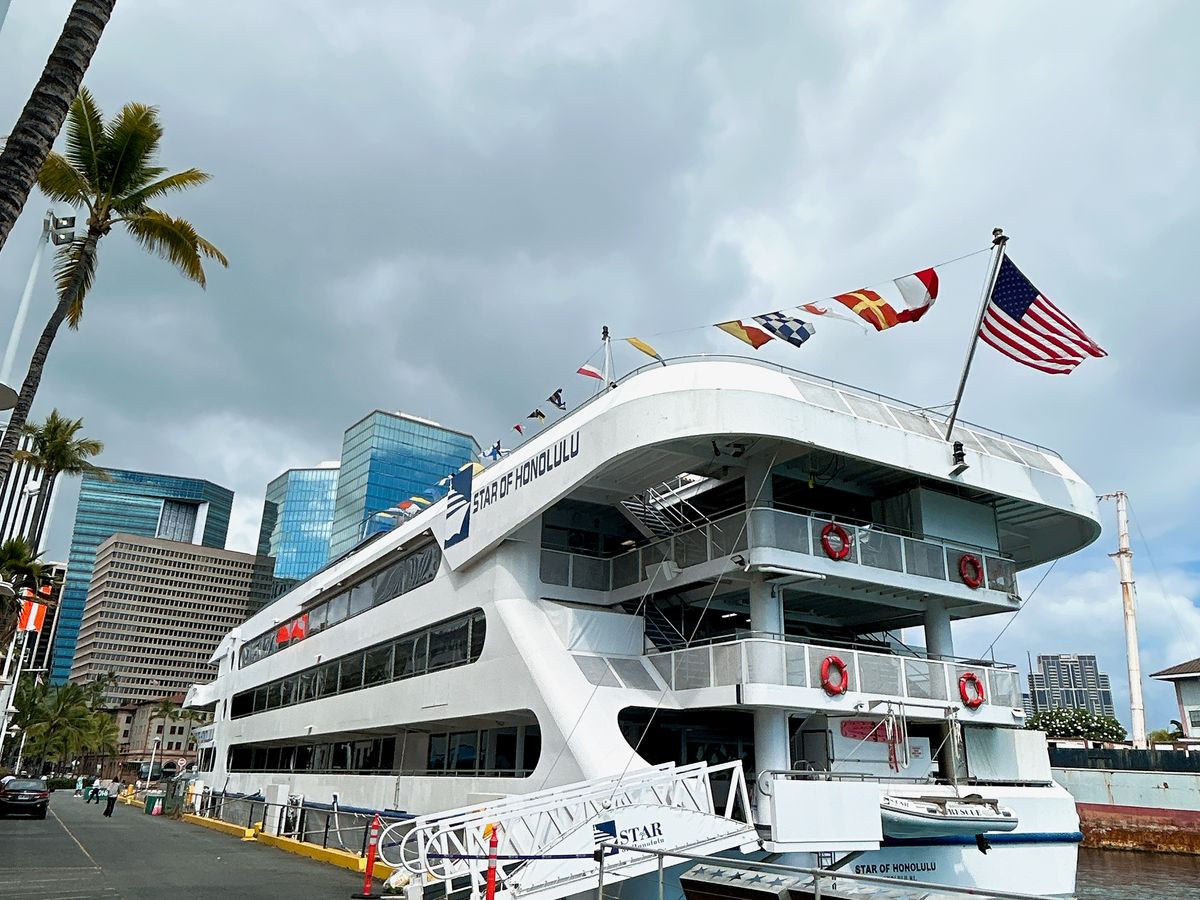 スターオブホノルル号すごく大きかったです!デザート付きのビュッフェコースに参加して、ショーがあり楽しかったです!日本人より外国人の方が観光客でも多い印象でした!