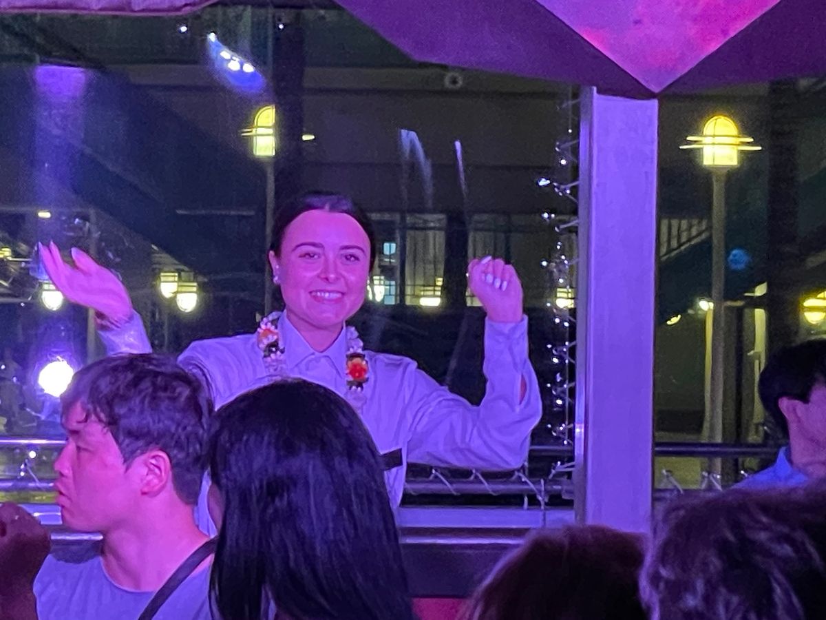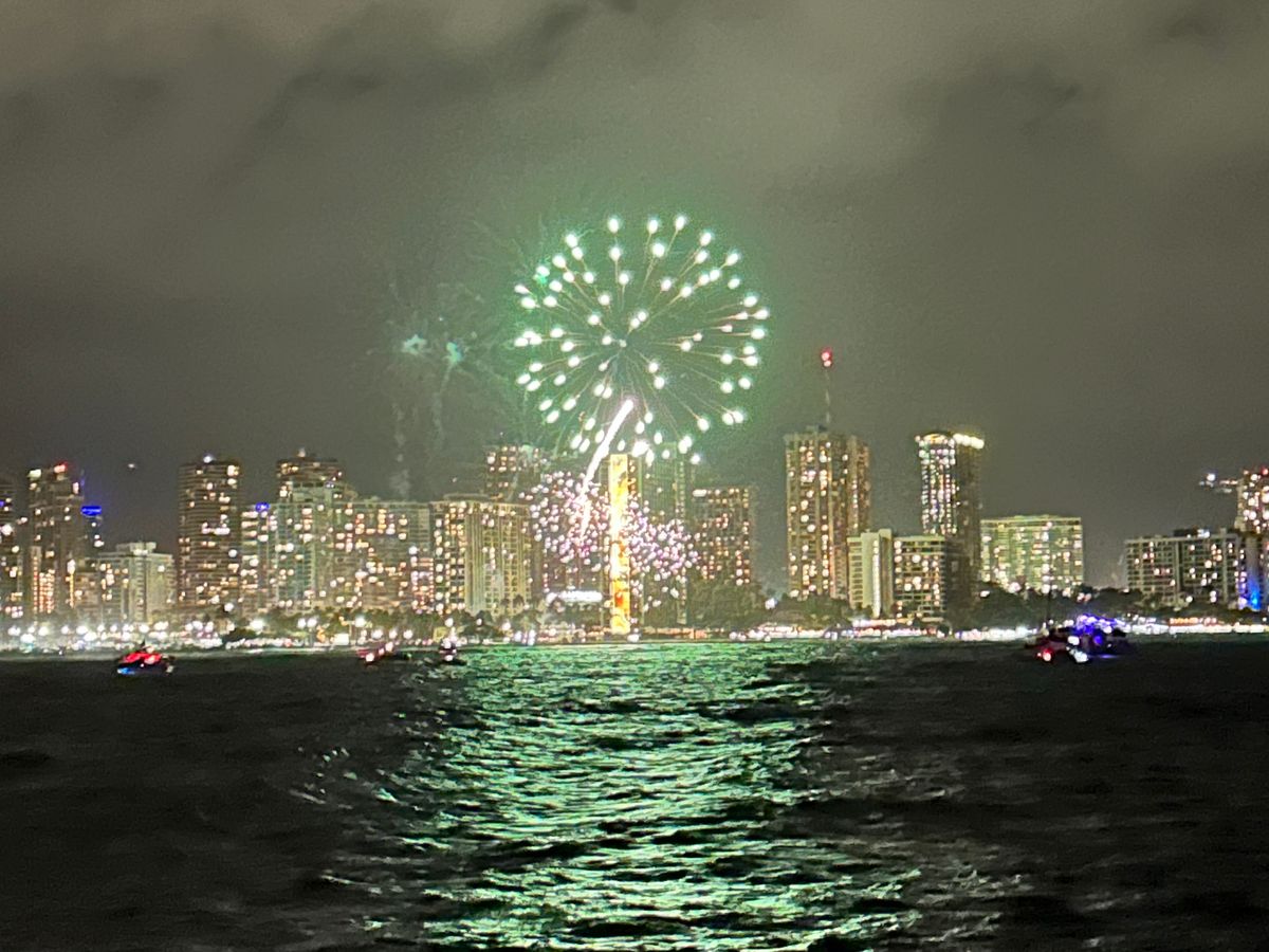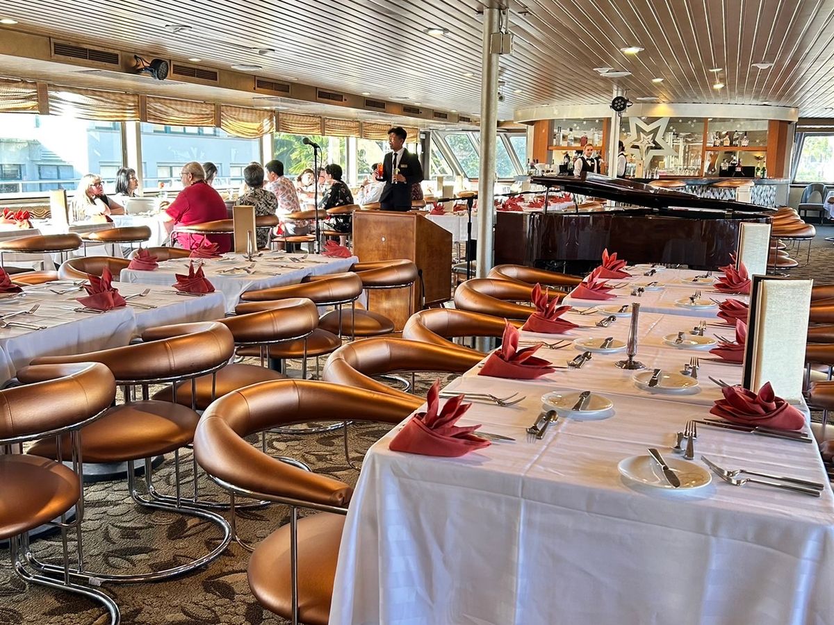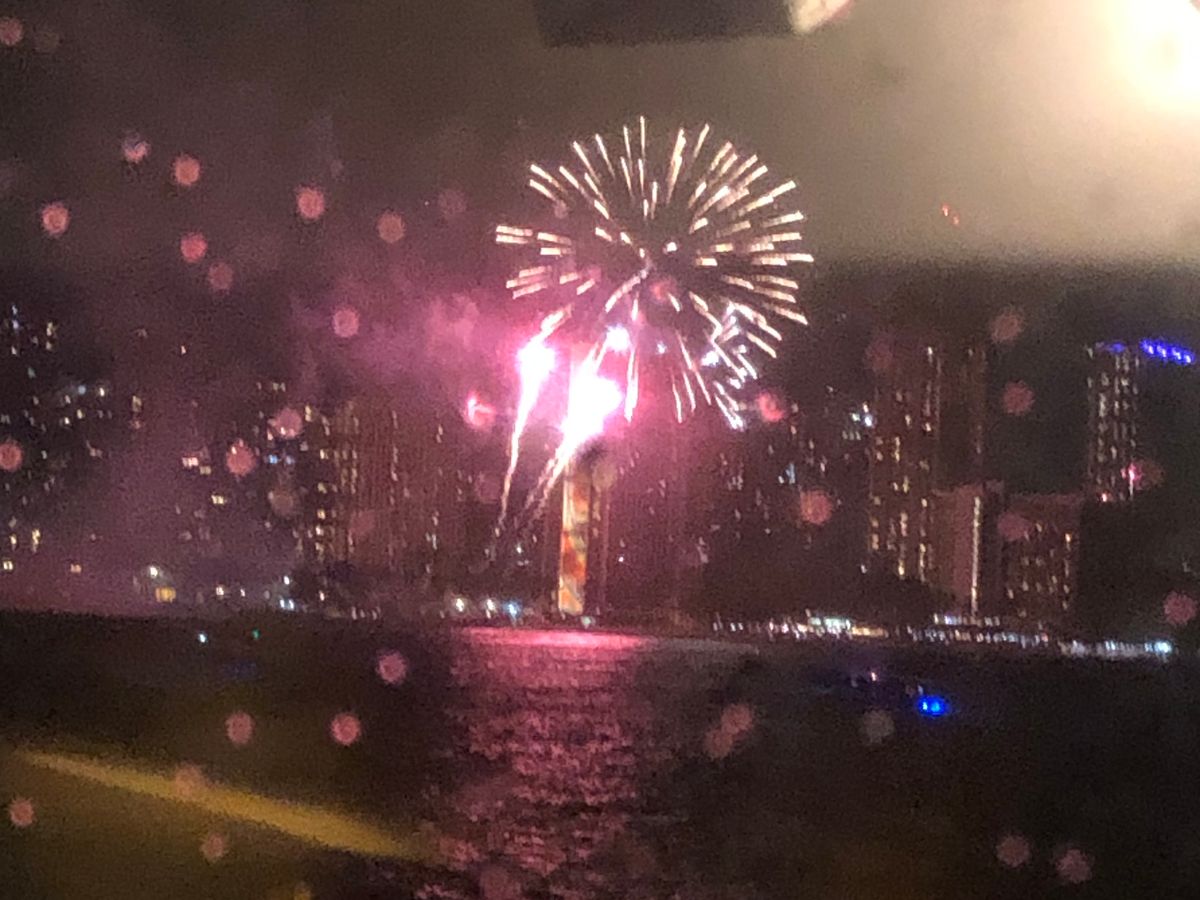 指定された席は窓側だったが、通路に人が留まり写真を撮るなどしていたため落ち着かなかった。また、花火は、反対側の窓側で打ち上げられたが、始まる前から人が窓側に集まってしまい視界を遮ったため、よく見えなかったのが残念だった。ディナークルーズは8年ぶり2度目の参加だったが、料理はほぼ想定通り、乗客に日本人は少なく7~8割がアメリカ人といった印象だった。フィナーレでYMCAを全員で踊るなど演出は8年前と同じだったが、料金は3~4倍になっており、物価高の影響を切実に感じるイベントだった。