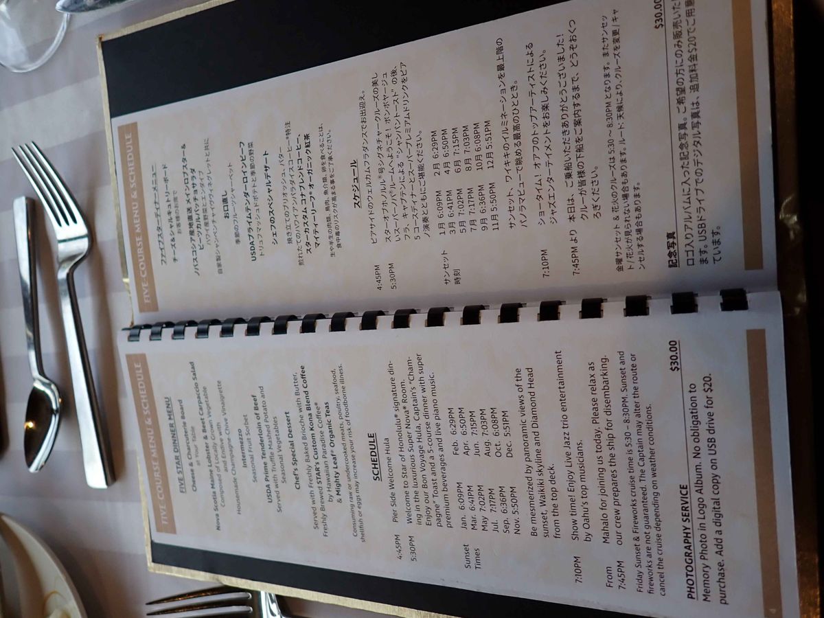ウエルカムハワイアンダンスから始まり、席もバラの花が飾ってあり、これからの素晴らしいディナーを予測できる演出でした。ピアノの生演奏でスイングジャズが流れる中、スタートでした。私たちは、結婚50周年の記念にと申し込んだディナークルーズでした。船の専属のカメラマンが、2人の記念に残るような写真を作成してくれ、退出する前には、アルバムにしていただきました。とても記念になりました。食事もおいしく、素敵な時間を過ごすことができました。ありがとうございました。